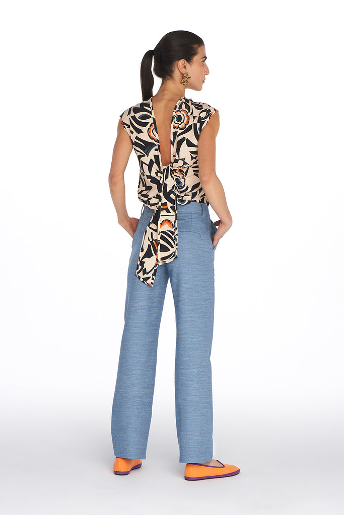 • Light blue straight long pants with waistband, belt loops, side pockets and a patch pocket in back right side.