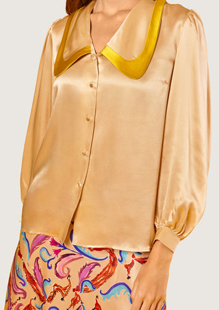 • Blusa recta beige de manga larga abullonada con puño. Pieza decorativa amarilla en cuello largo de puntas redondeadas.