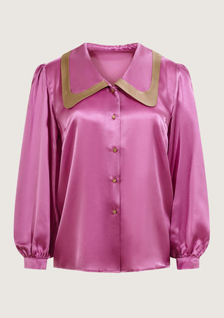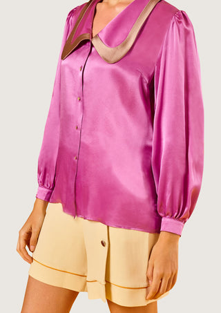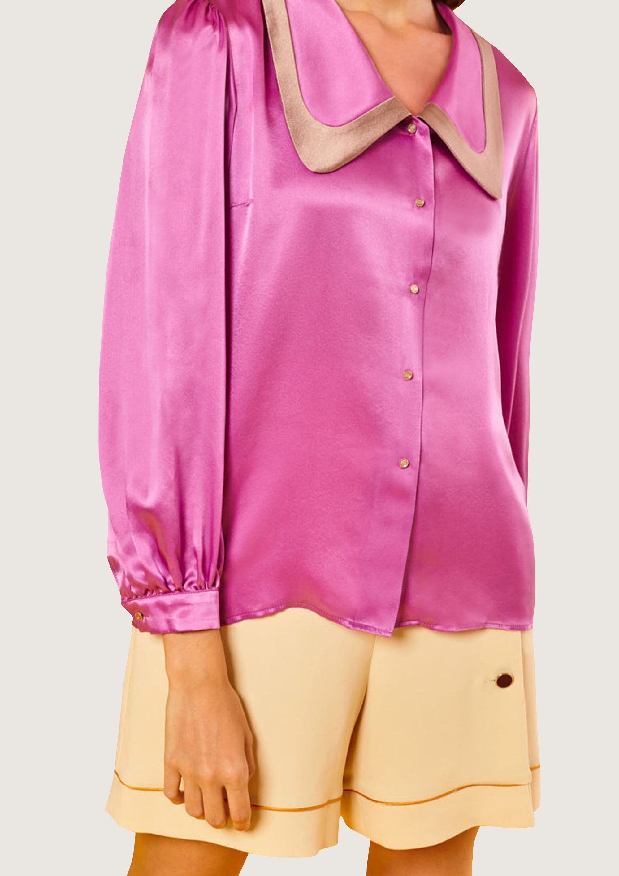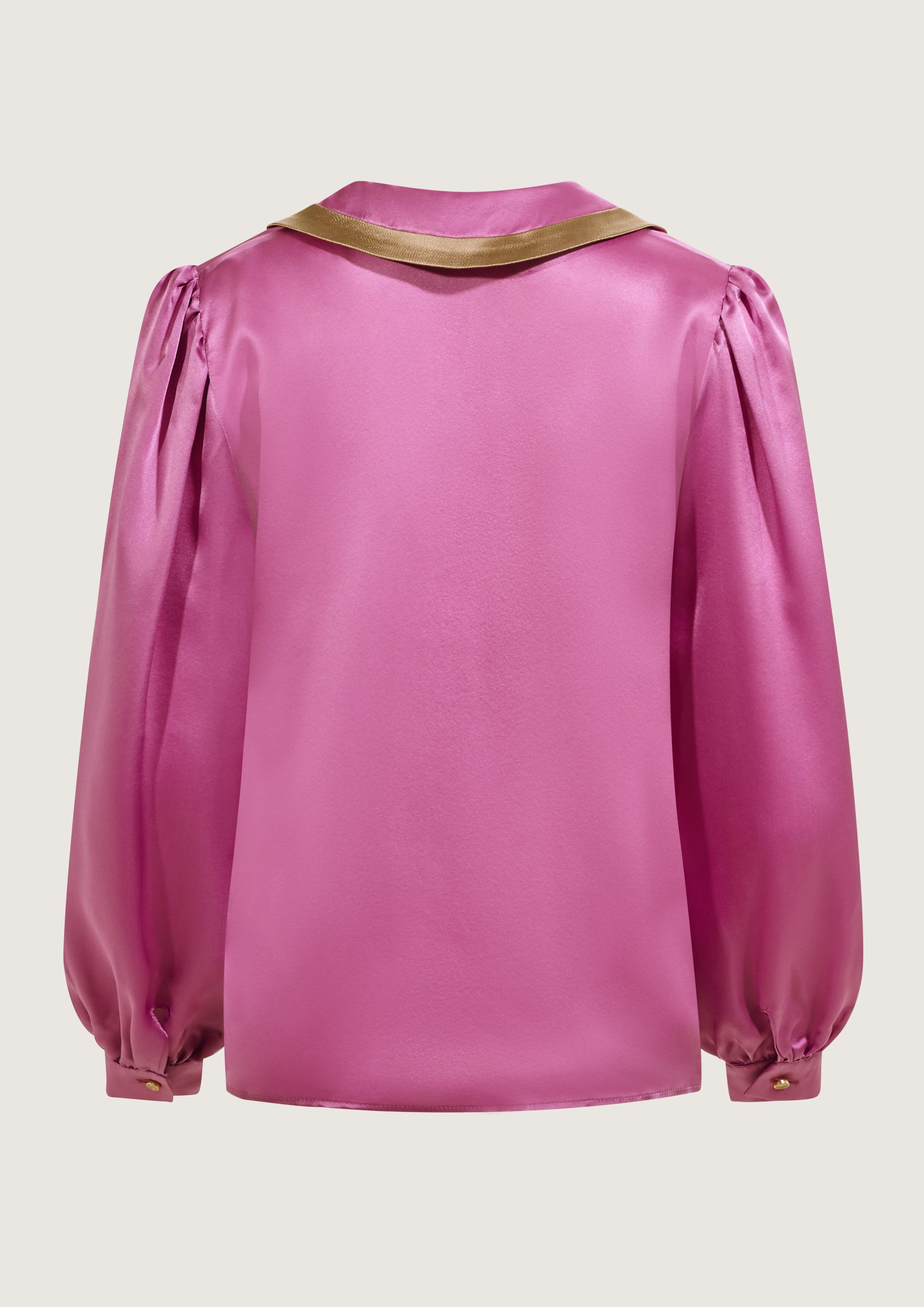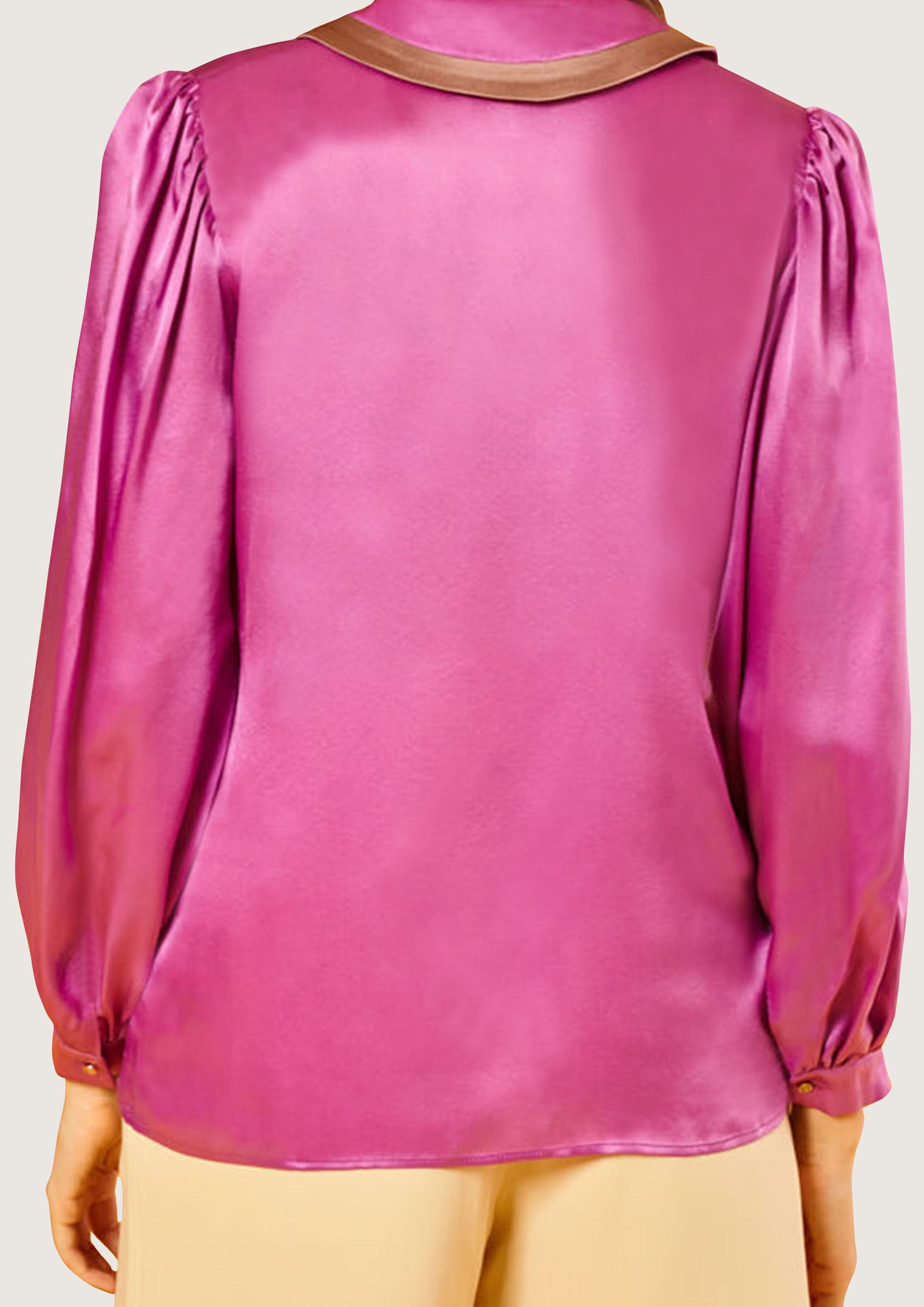 • Blusa recta rosa de manga larga abullonada y puño. Pieza decorativa beige en cuello largo de puntas redondeadas.