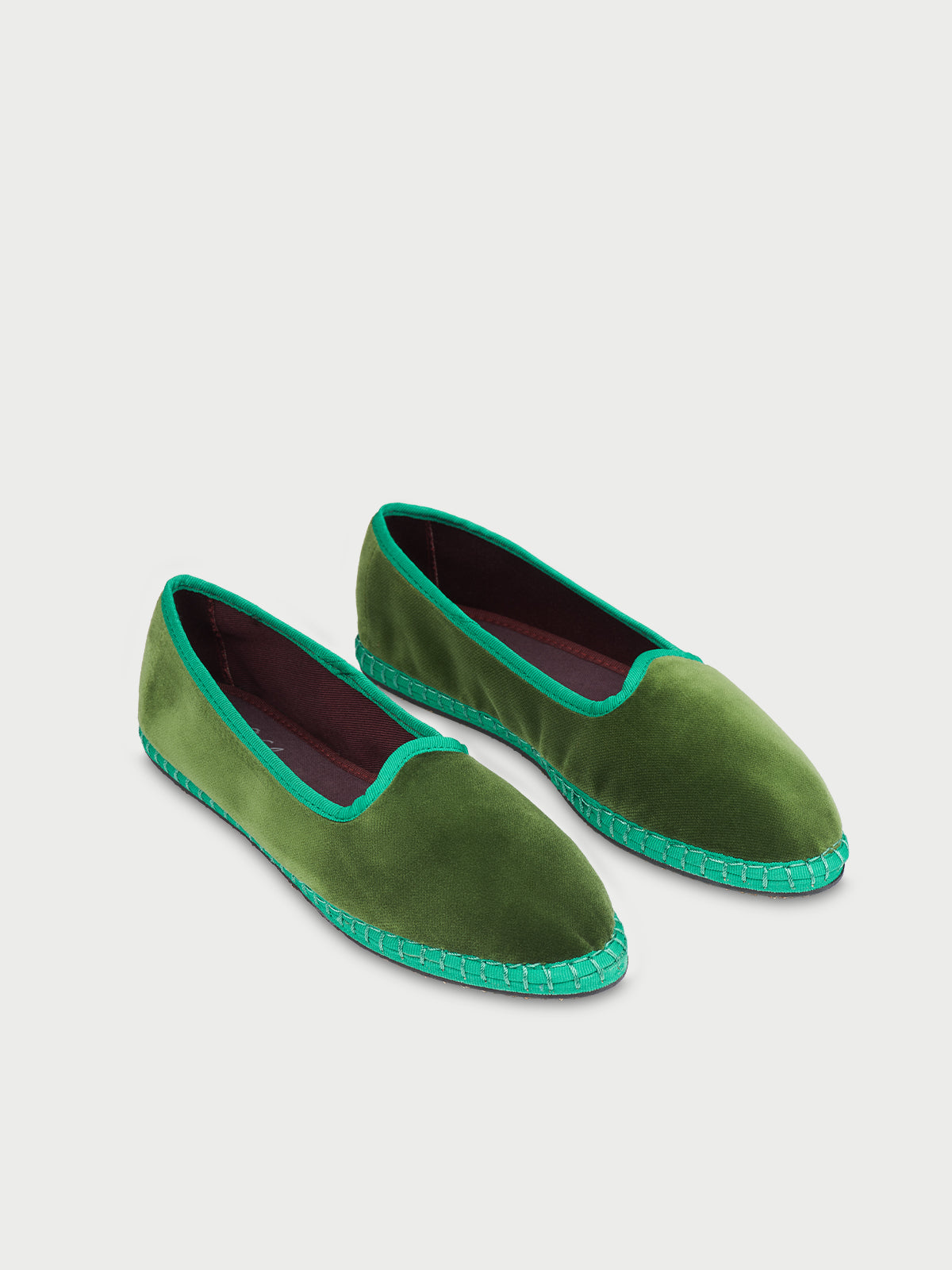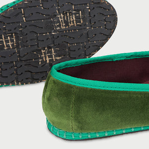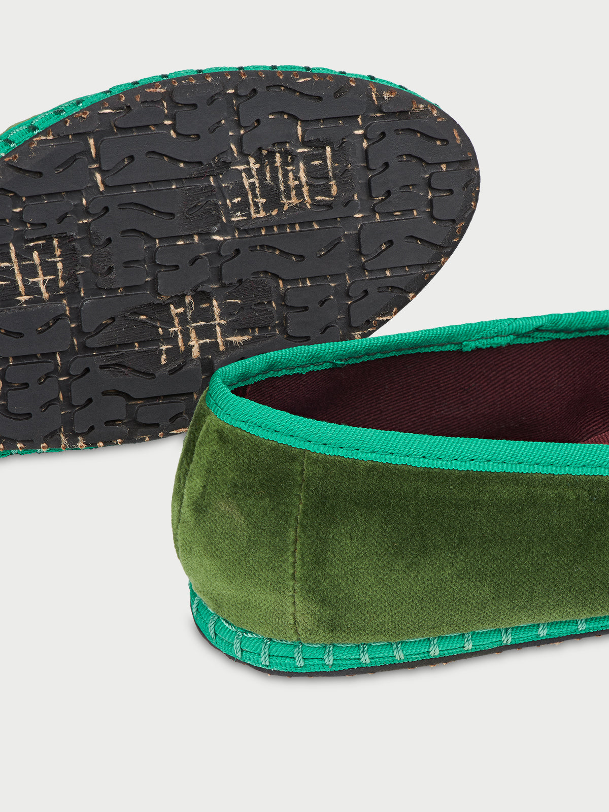 • Slipper de terciopelo en verde con ribetes en verde claro.