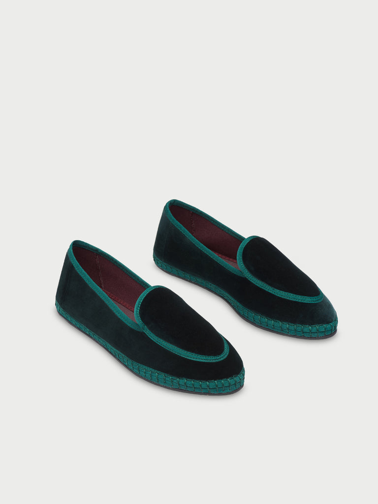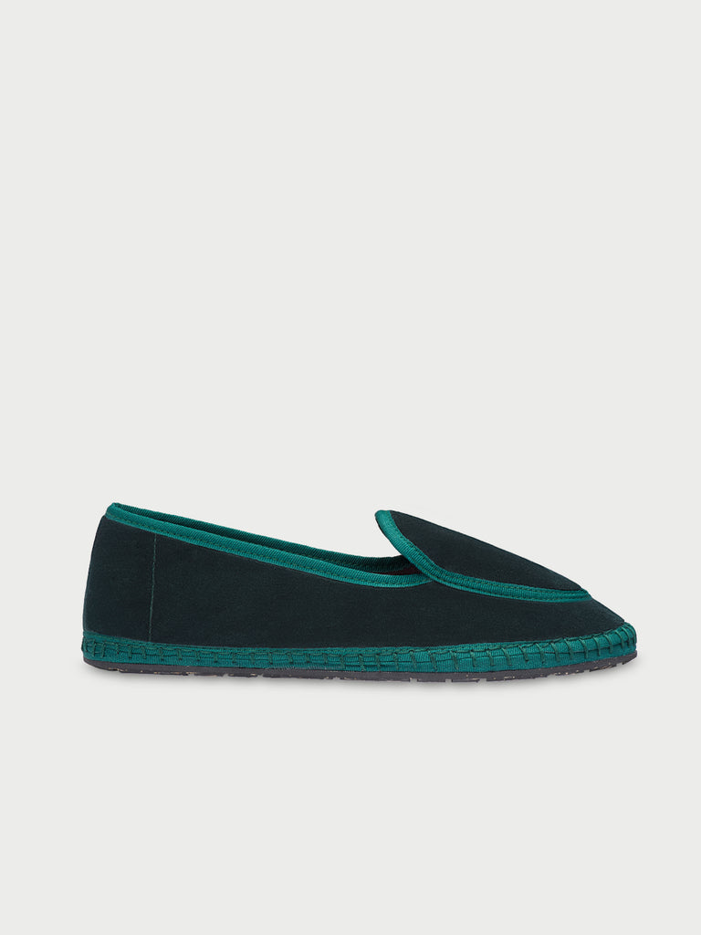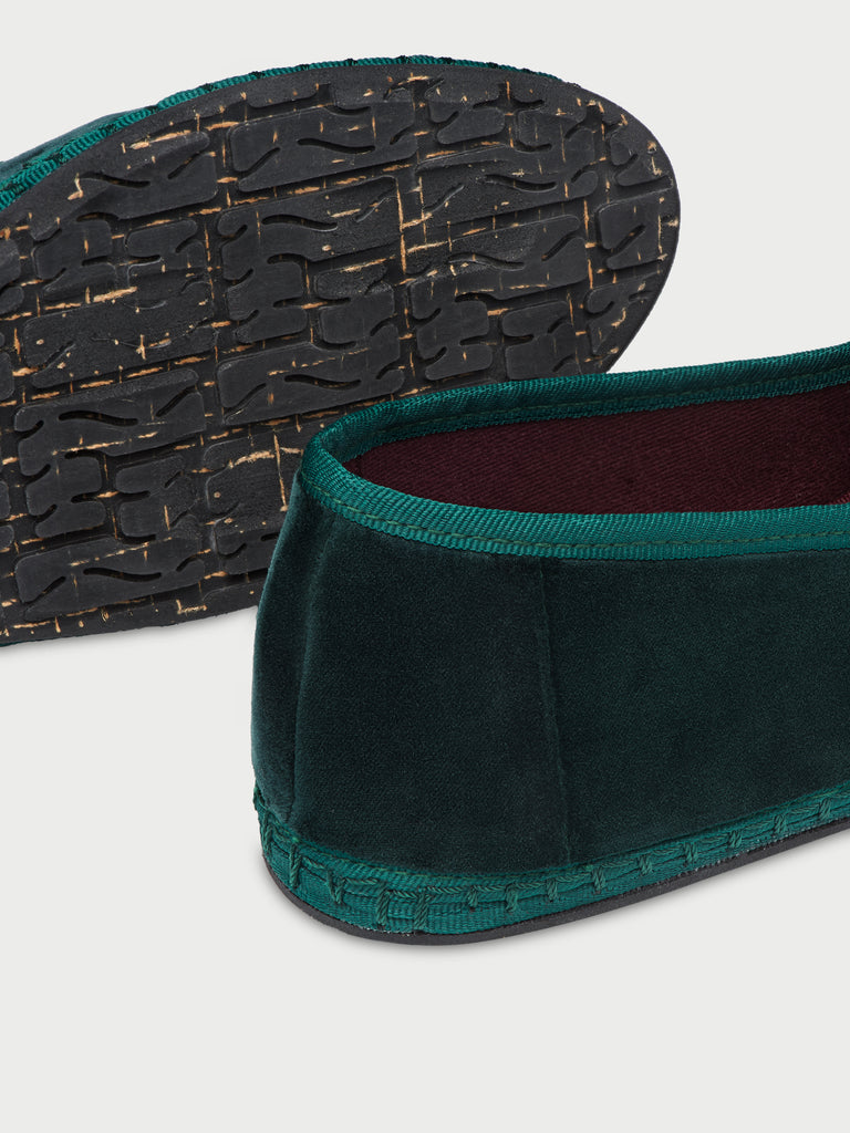 • Belgian de terciopelo en color verde oscuro con empeine verde oscuro y ribetes verdes.