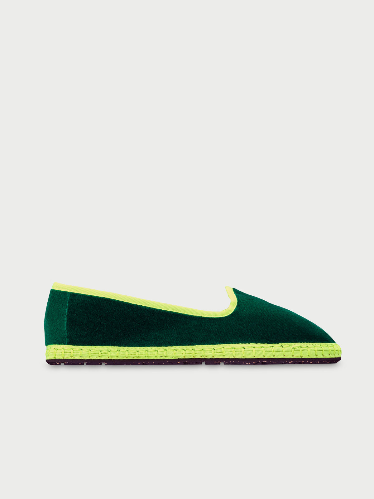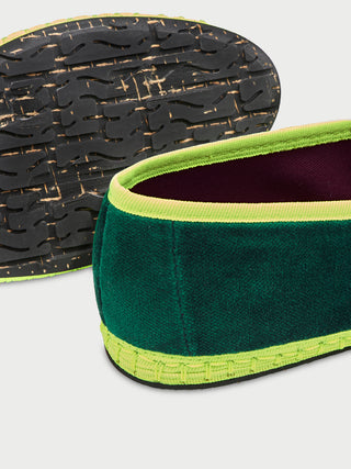 • Slippers de terciopelo en verde oscuro con ribetes en verde neón.