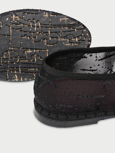 • Merceditas negras en malla brillante con ribete negro y una banda elástica negra.