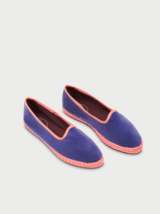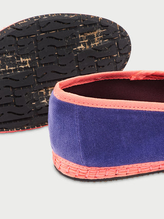 • Slipper de terciopelo en azul oscuro con ribetes en rosa claro.
