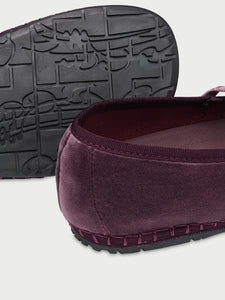 • Zapatilla de terciopelo morado con ribete morado y dos bandas elásticas lila.