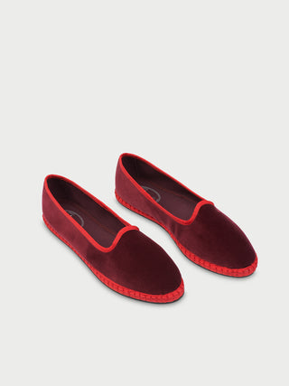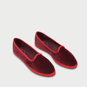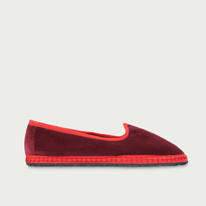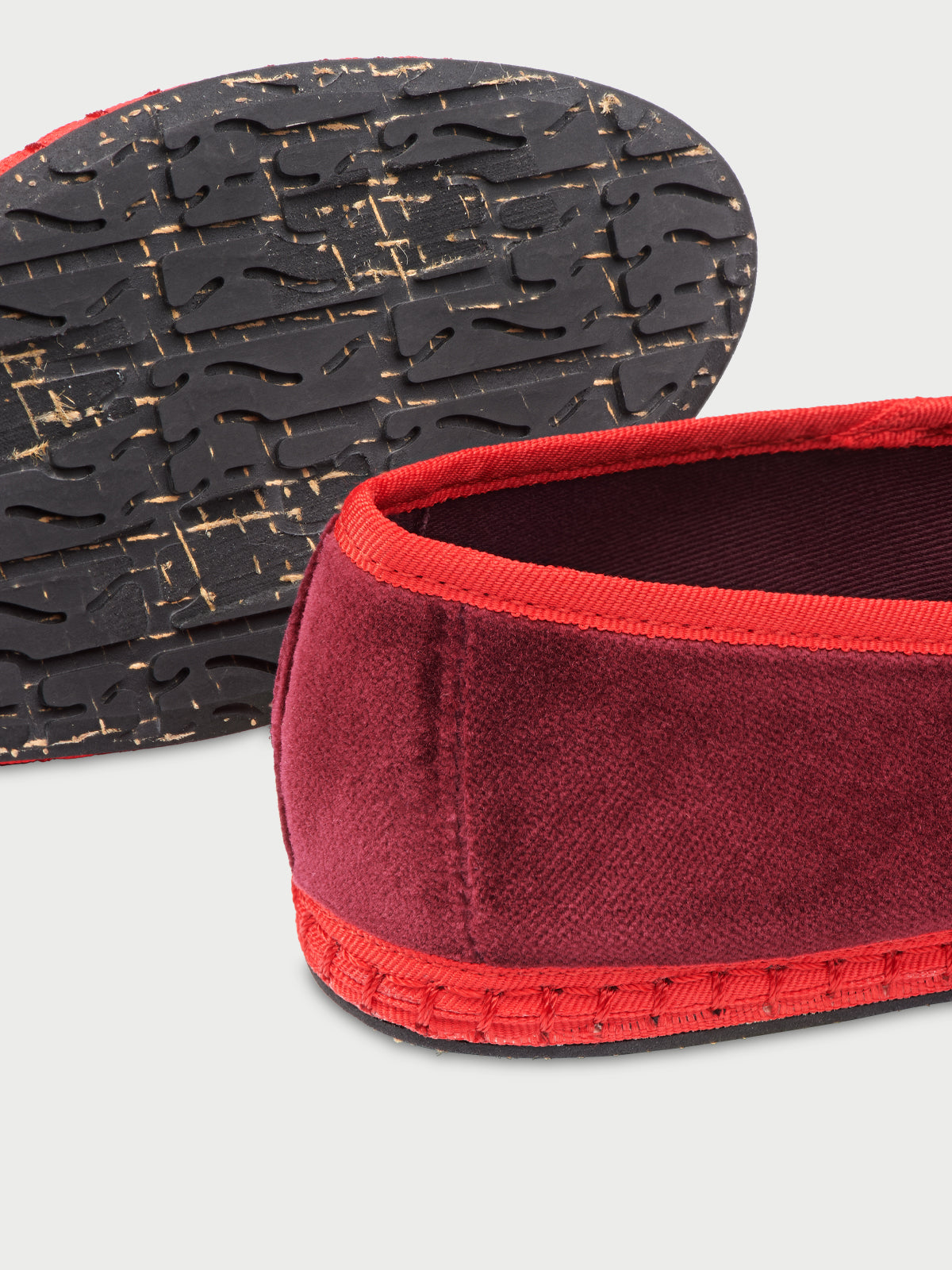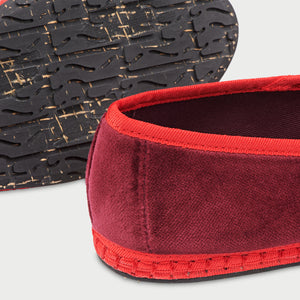 • Slipper de terciopelo en rojo oscuro con ribetes rojos.