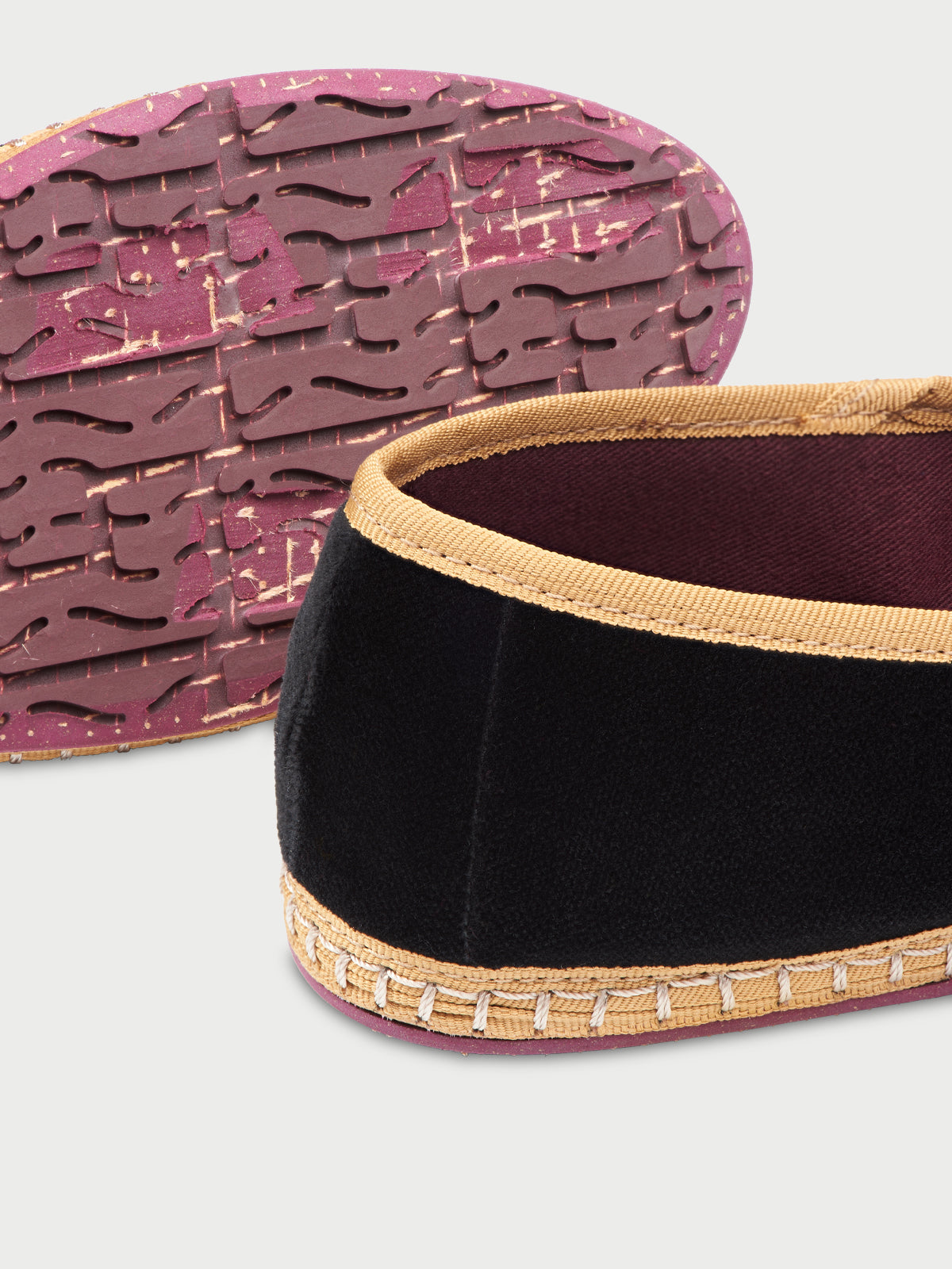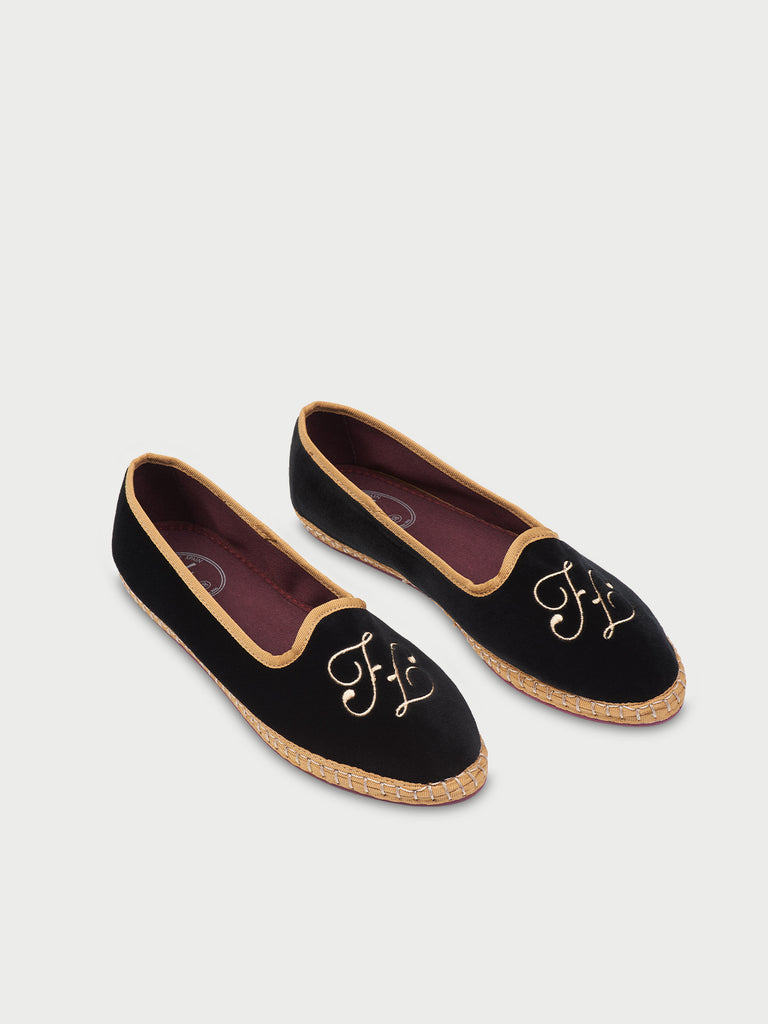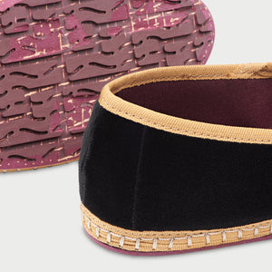• Slipper de terciopelo en color negro con ribetes amarillos y logo amarillo bordado en la parte superior.
