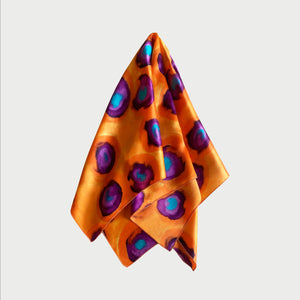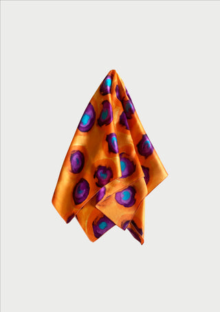• Pañuelo cuadrado de seda estampado naranja y azul. 65x65. 100% seda.
