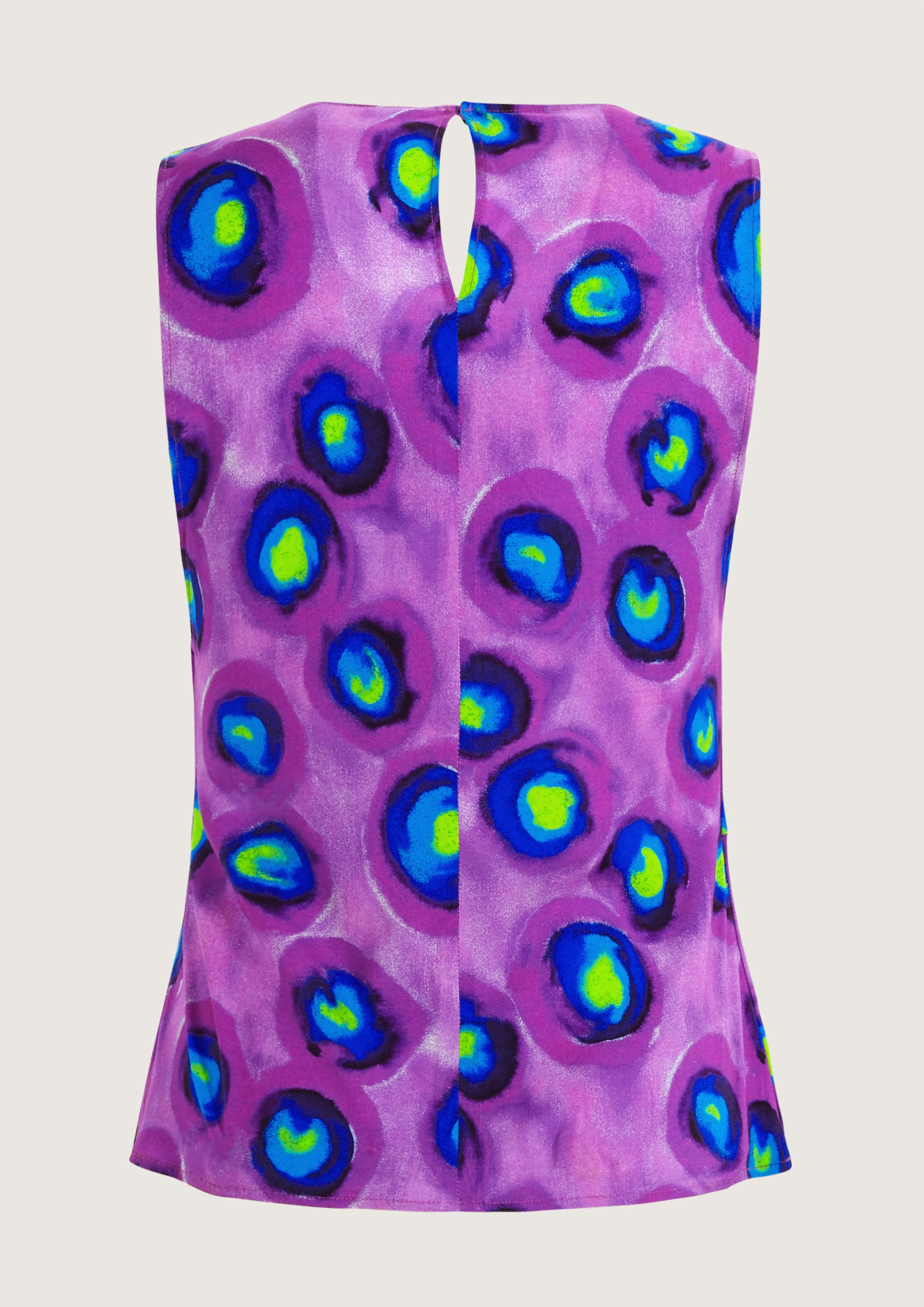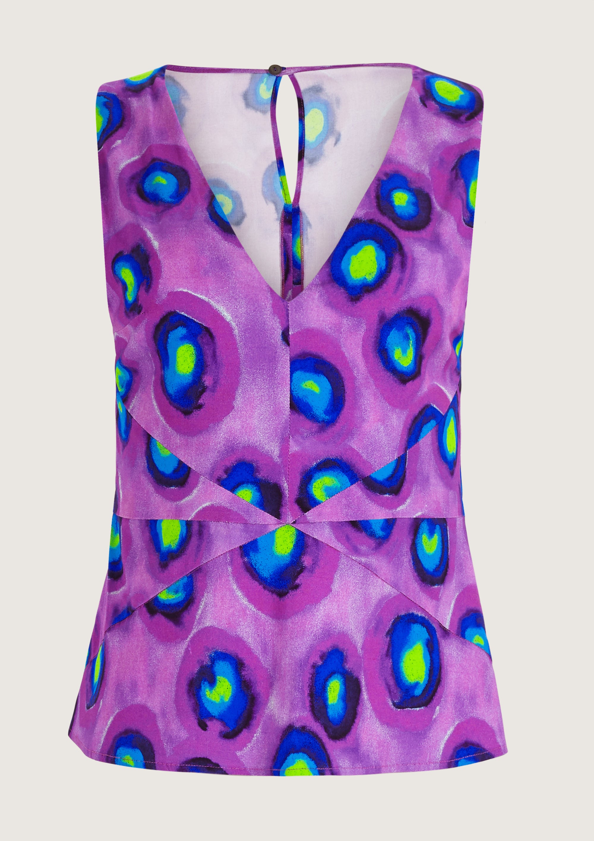 • Top sin mangas con escote en forma de V y dibujo tie-dye morado, azul y amarillo neón. Cortes en el delantero.