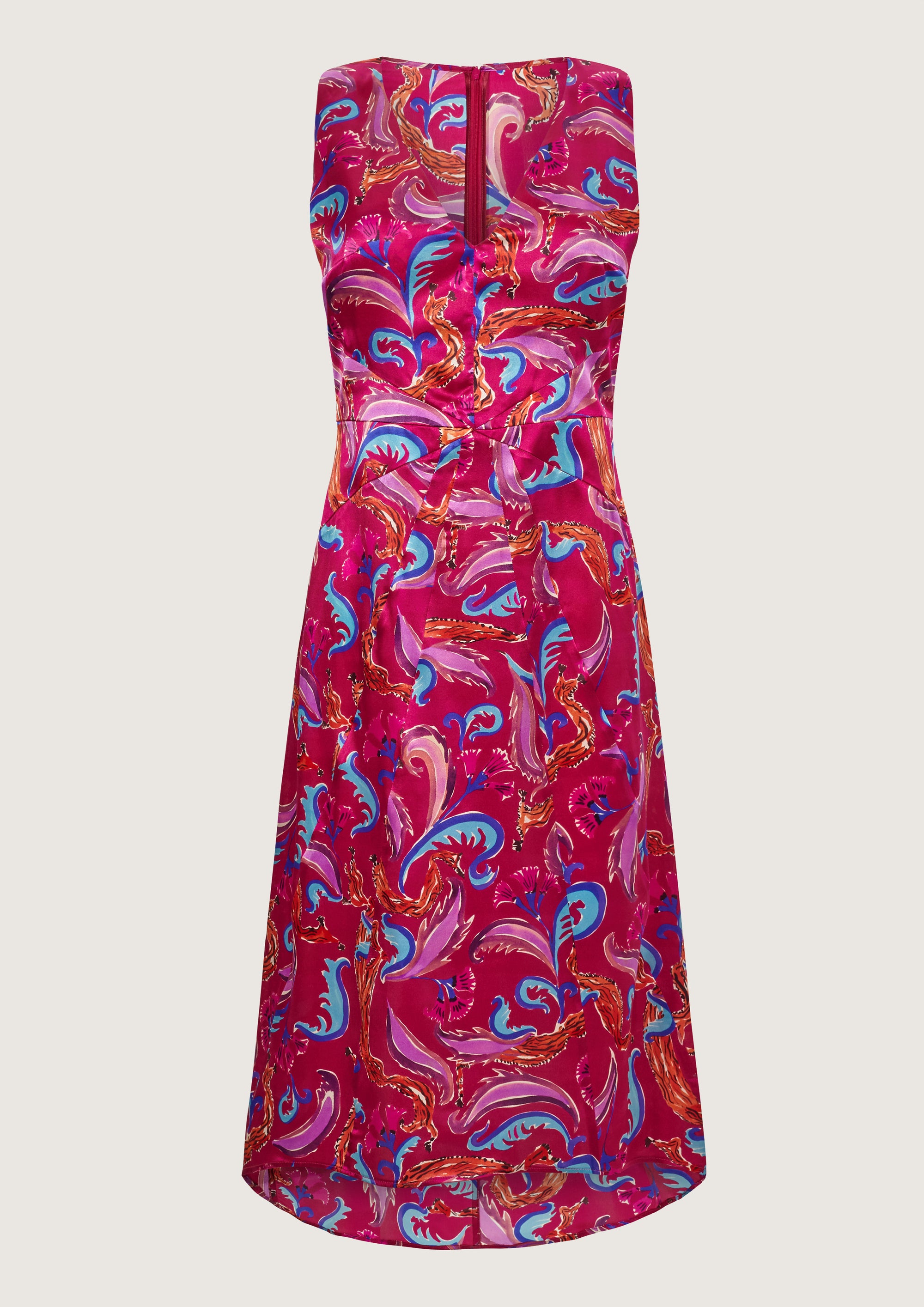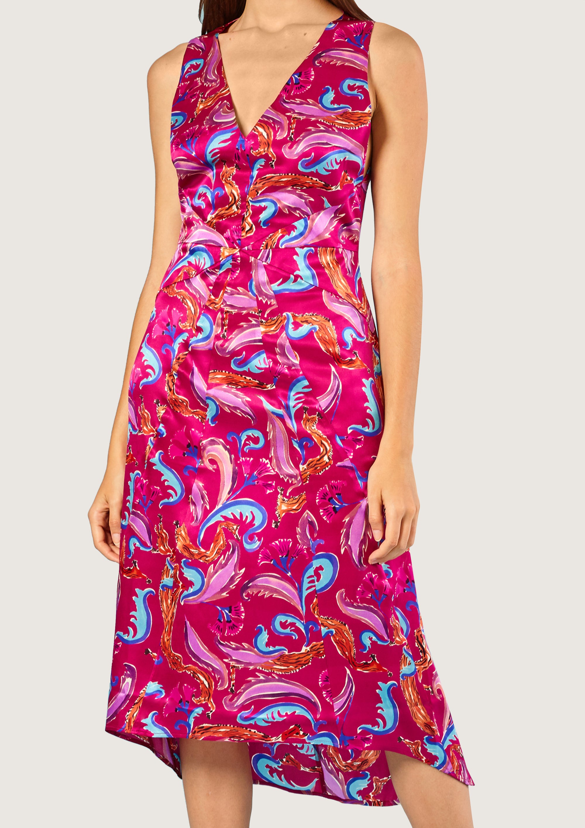 • Vestido largo midi sin mangas, escote en pico, rosa, fucsia, azul y naranja.