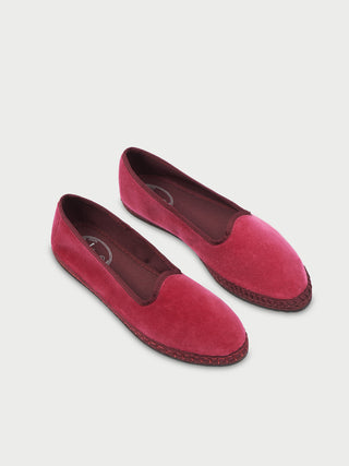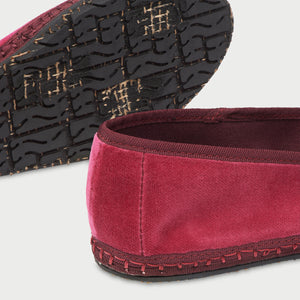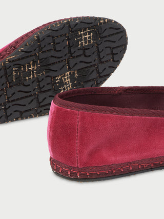 • Slipper de terciopelo en color fucsia con ribetes en color burdeos.
