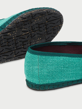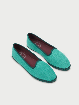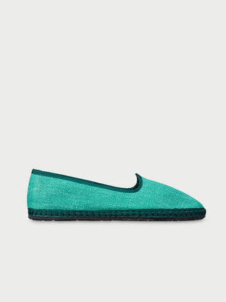 • Slipper de lino en verde con ribetes en verde oscuro.