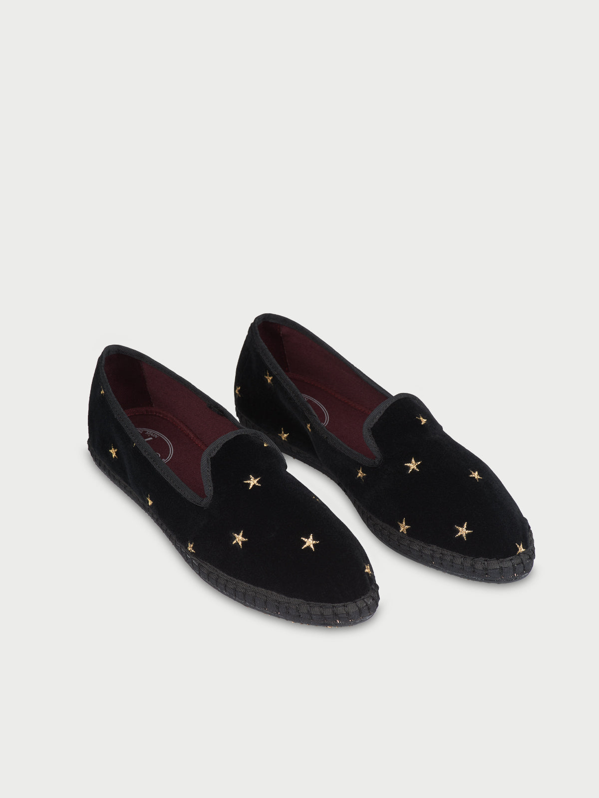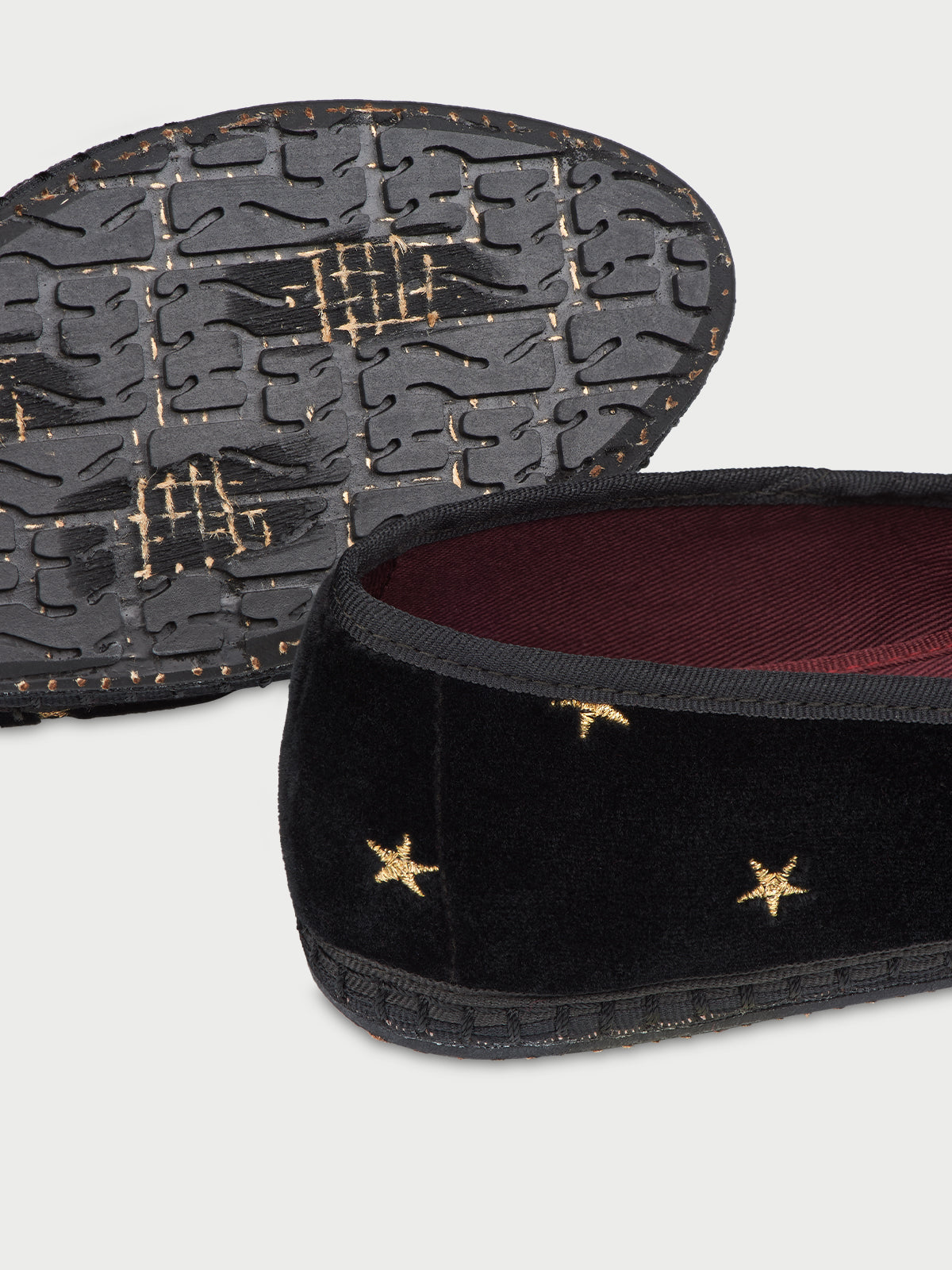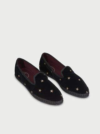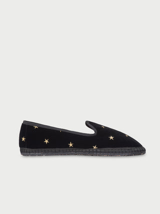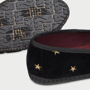 • Slipper de terciopelo negro con ribetes negros y estrellas cosidas en dorado.