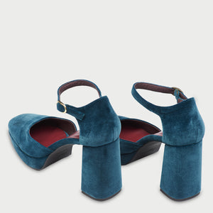 • Tacón de terciopelo azul petróleo con pulsera en el tobillo y cierre con hebilla.