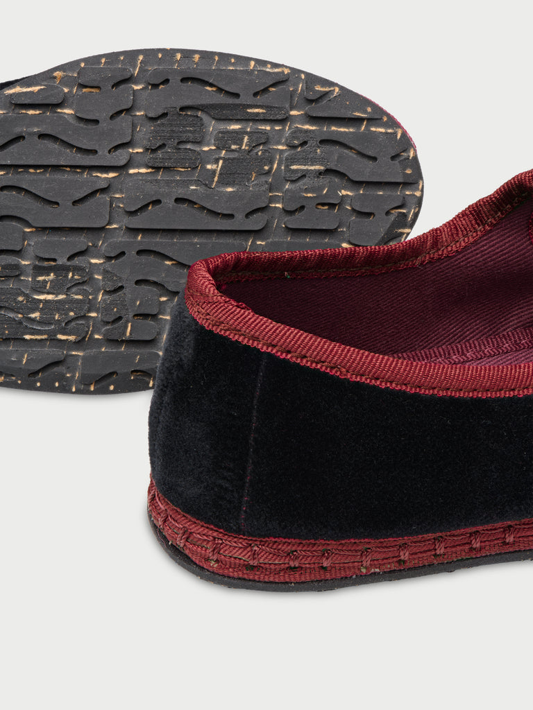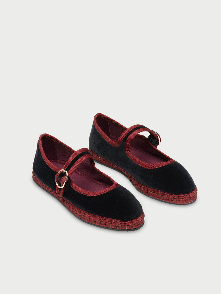 • Mercedita de terciopelo en color azul marino con ribetes rojos y cierre de hebilla.