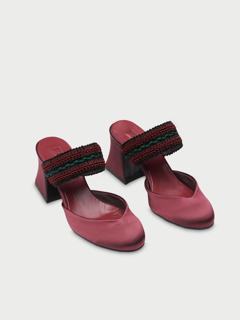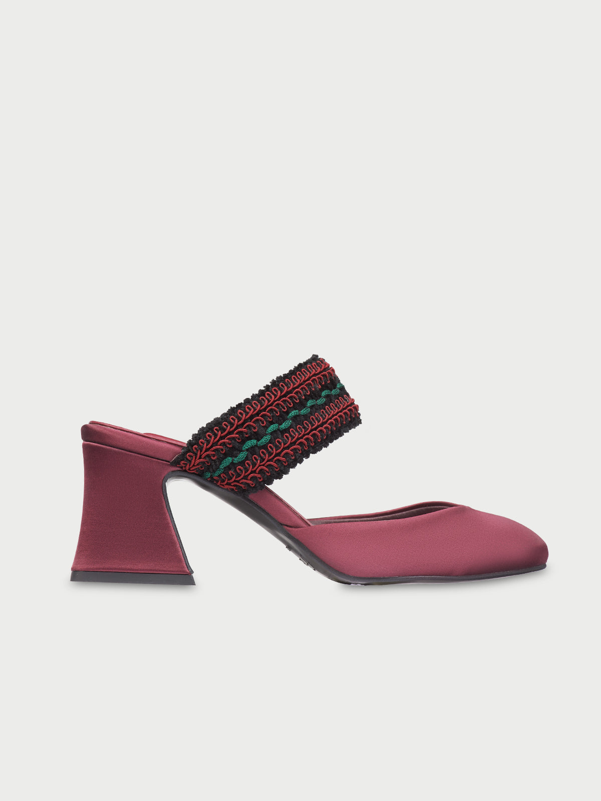 • Tacón de raso burdeos con tira bordada que cruza el empeine con detalles en rojo y verde.