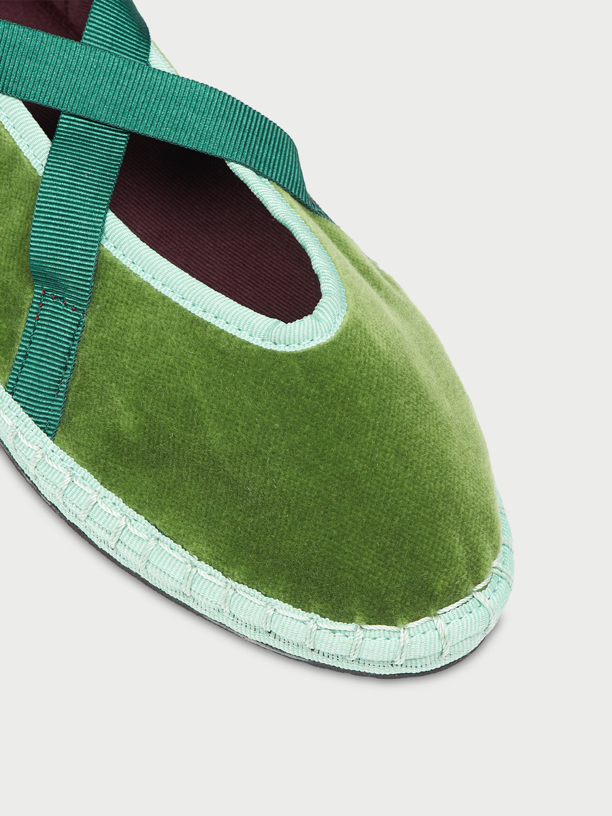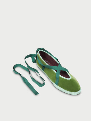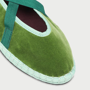 • Slipper de terciopelo en color verde con ribetes en verde claro y lazos en verde oscuro.
