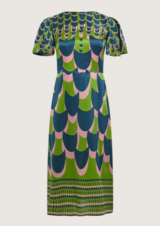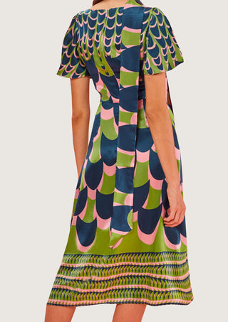 • Vestido largo midi de manga corta, escote redondo, color rosa, azul y verde.