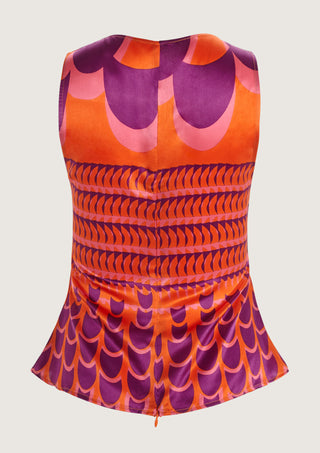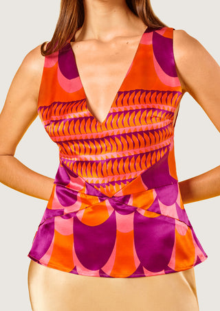 • Top sin mangas con escote en V morado y naranja. Cortes en el delantero.