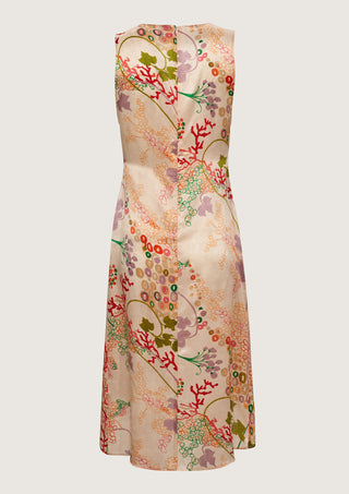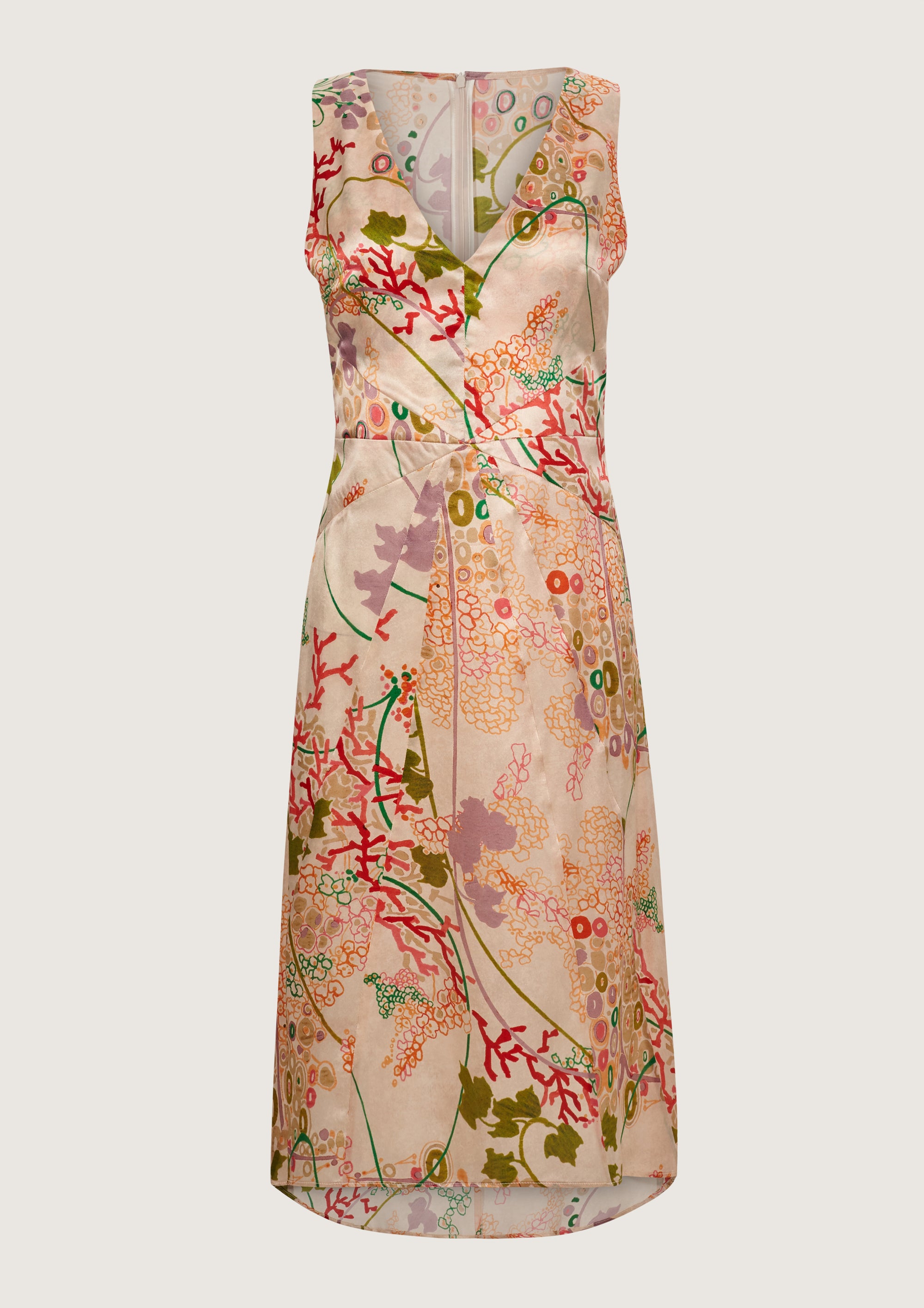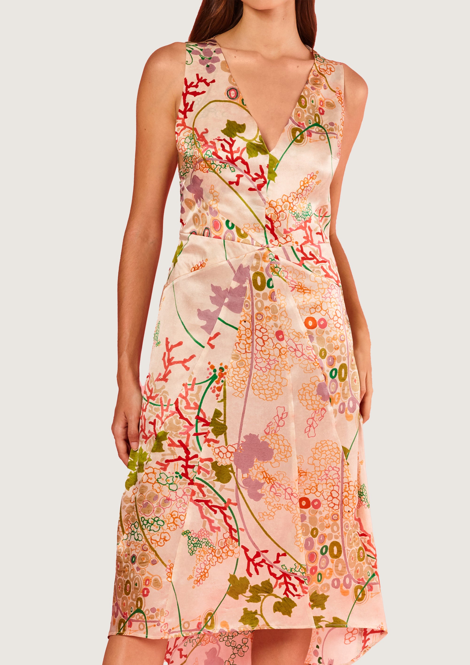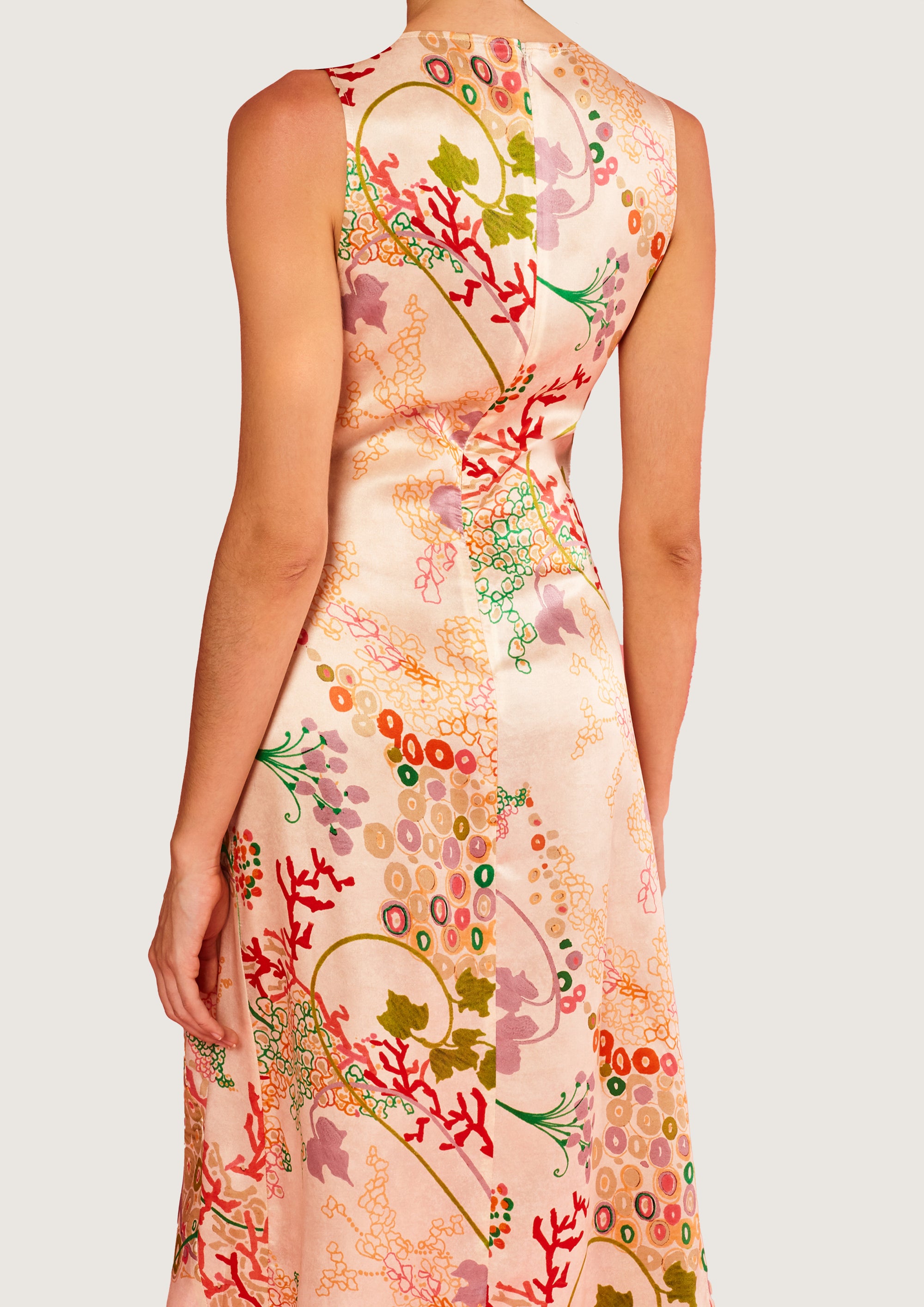 • Vestido midi sin mangas, escote en pico, rosa, fucsia, azul y naranja. Cortes en el delantero.