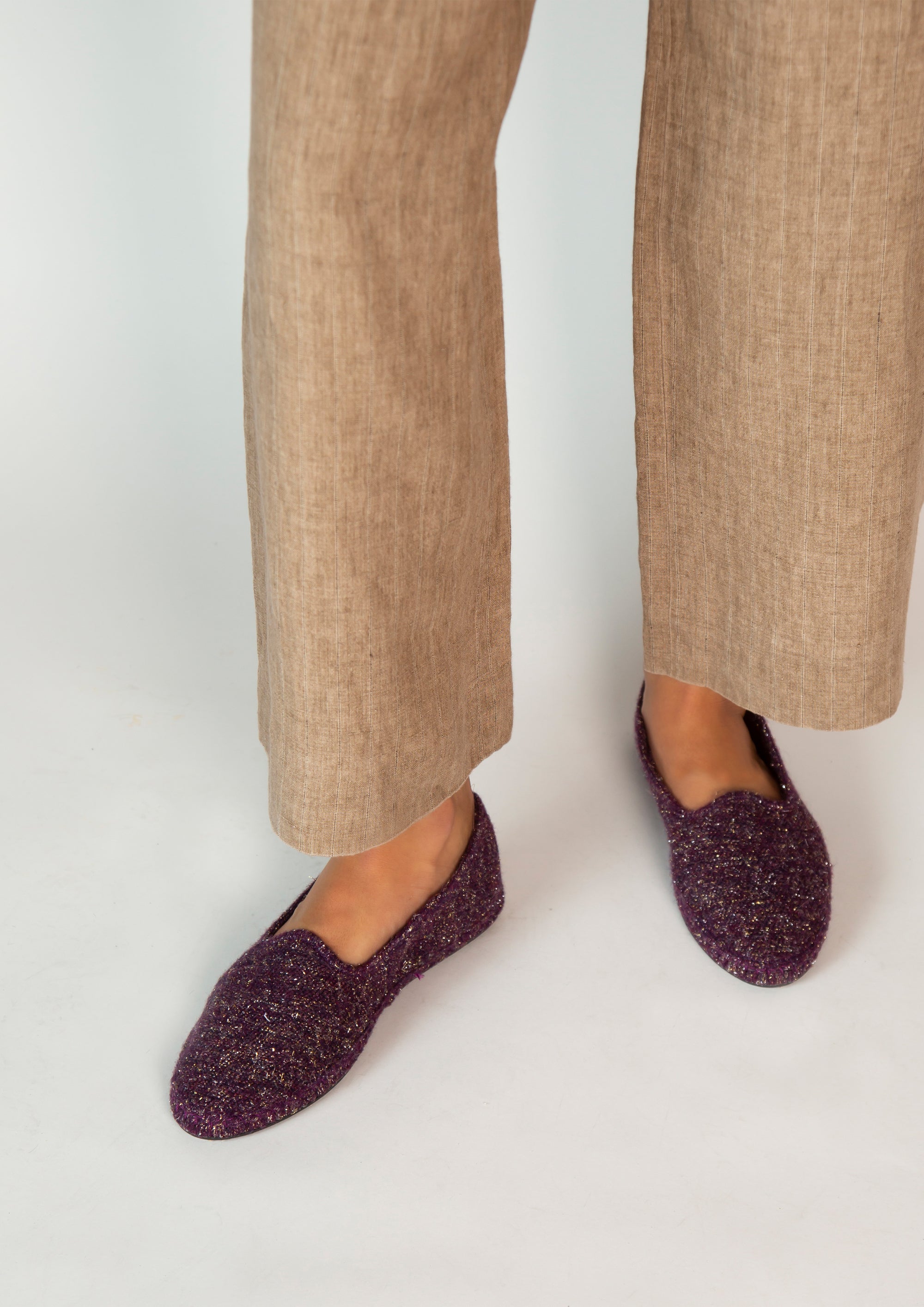• Slipper de lana y lúrex en color morado con ribetes morados.