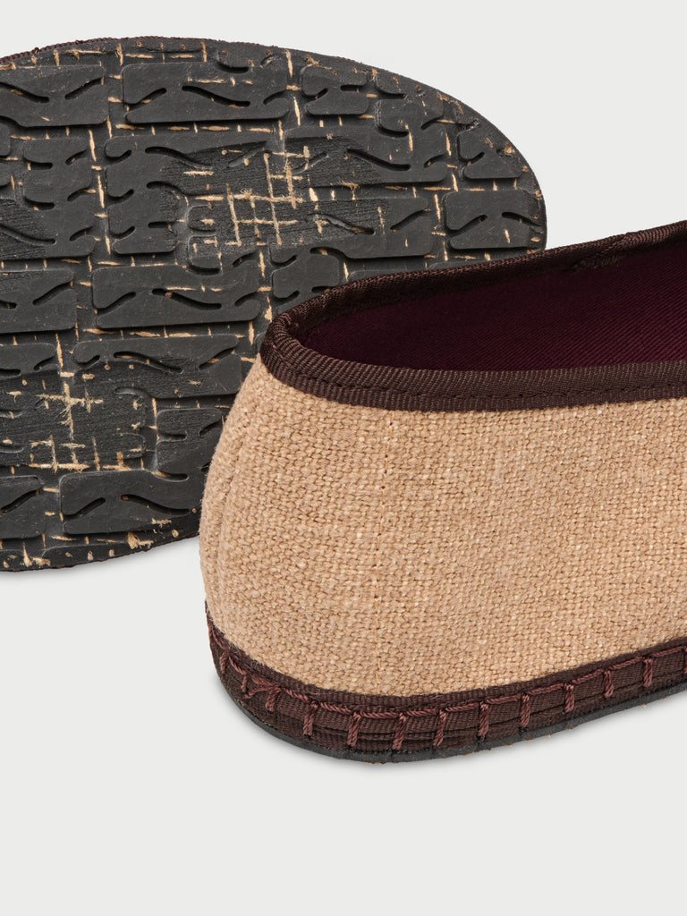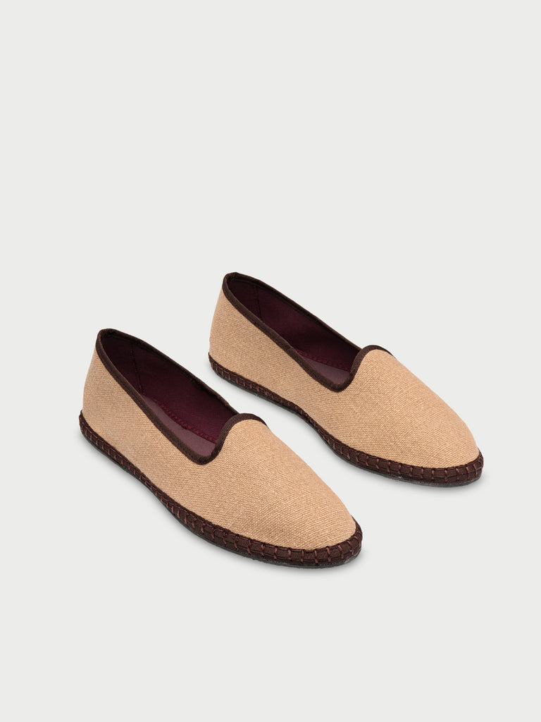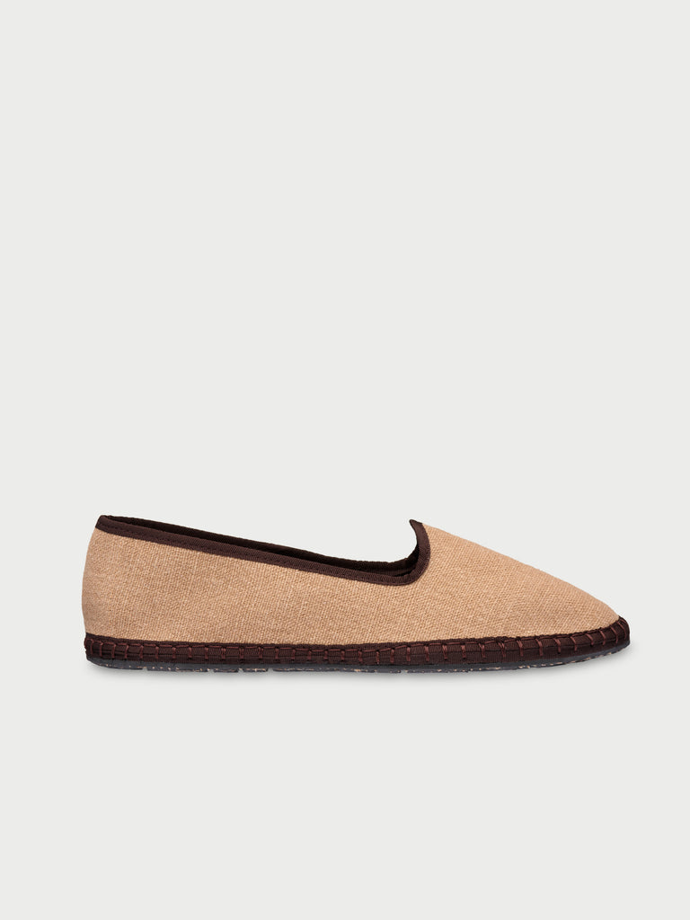 • Slipper de lino en color beige con ribetes marrones.