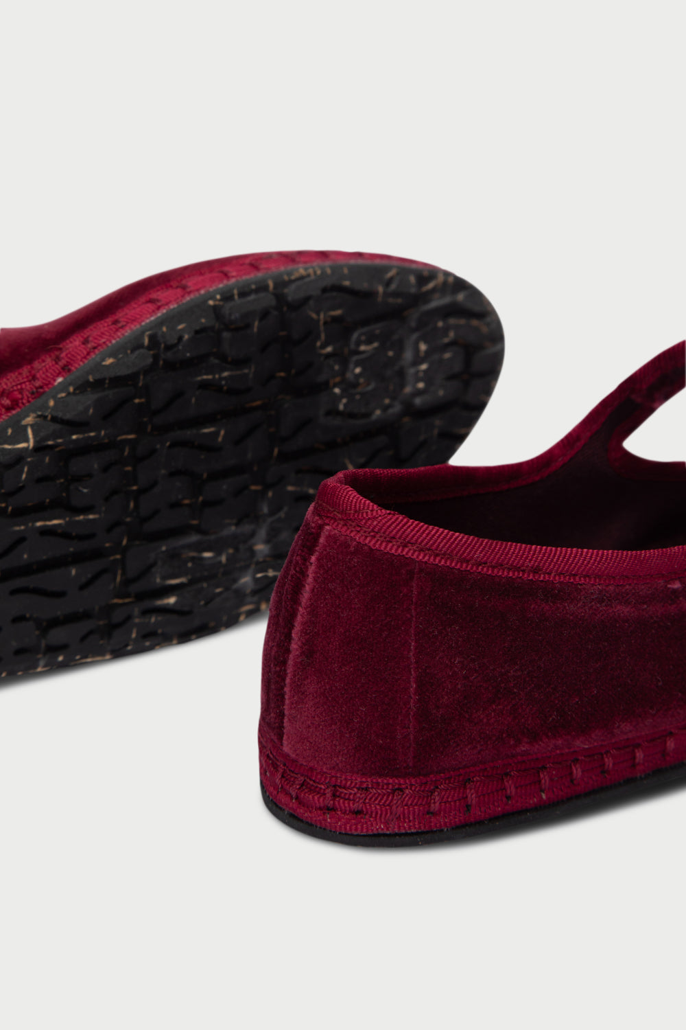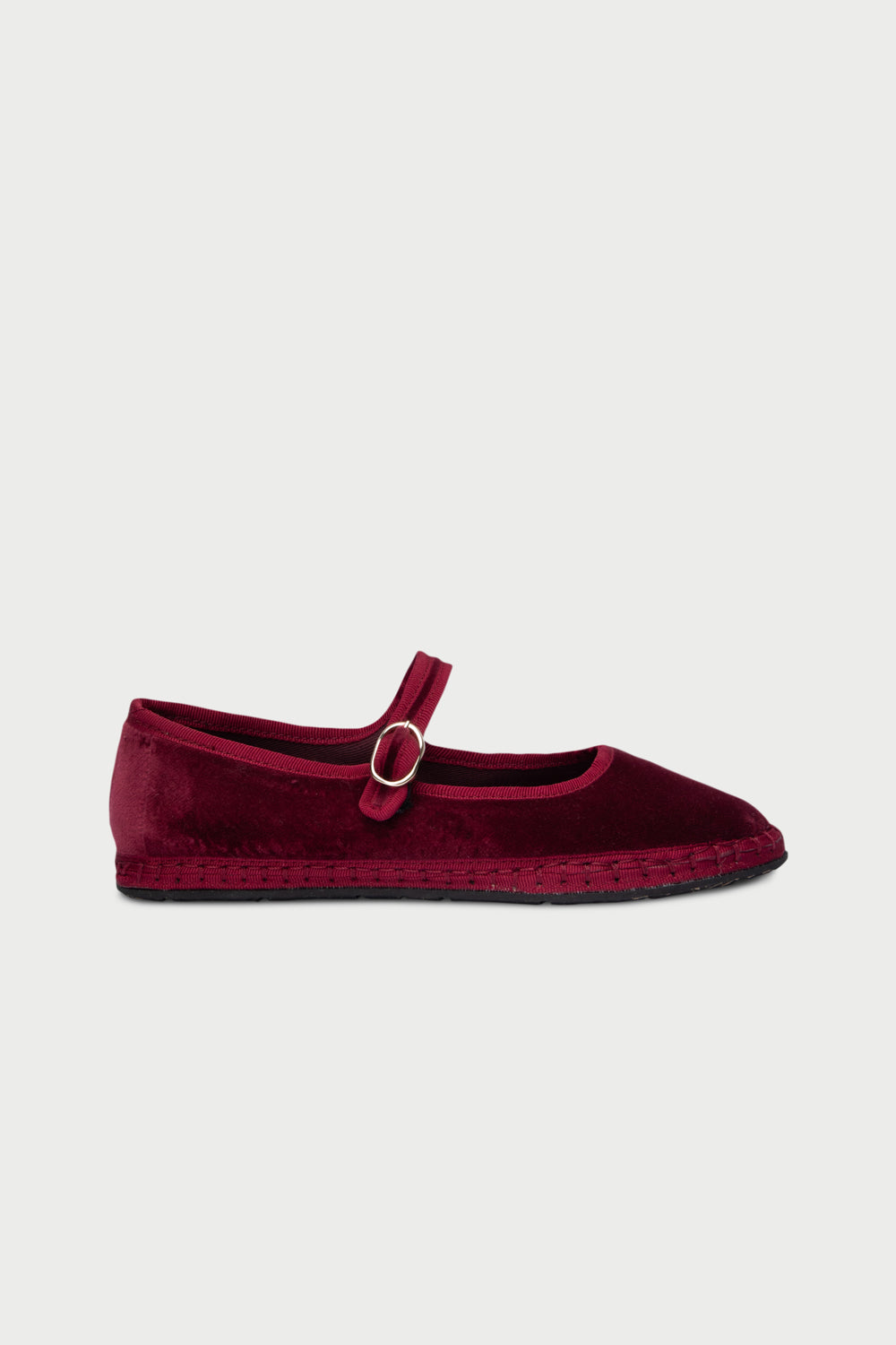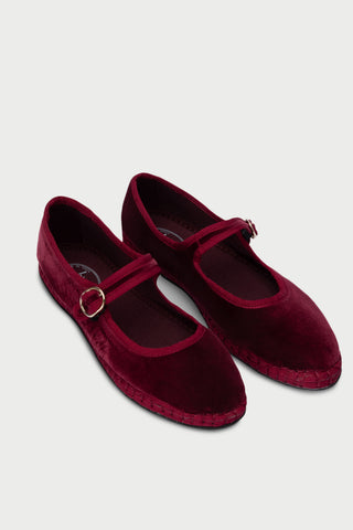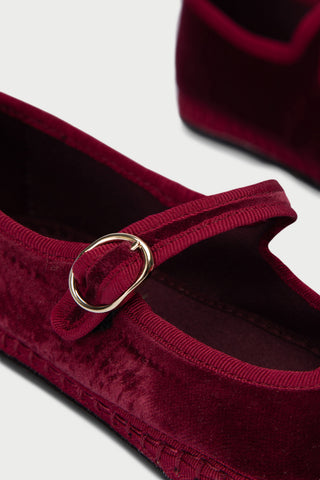 • Merceditas de terciopelo en color burdeos con ribetes en color burdeos y cierre de hebilla.