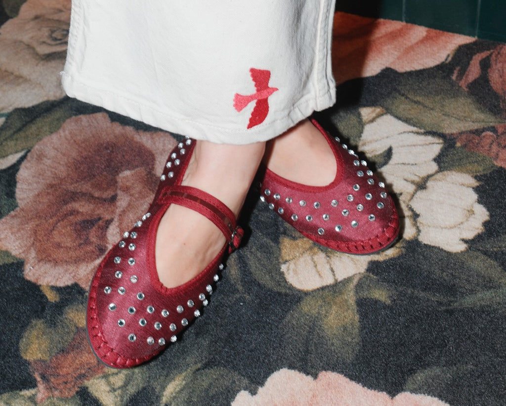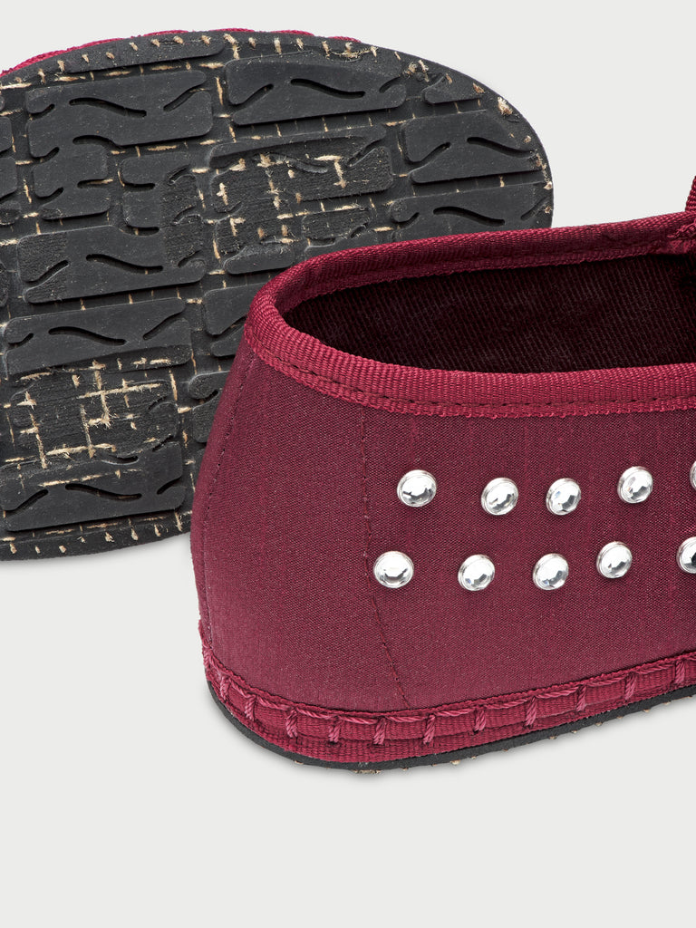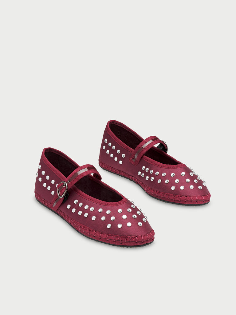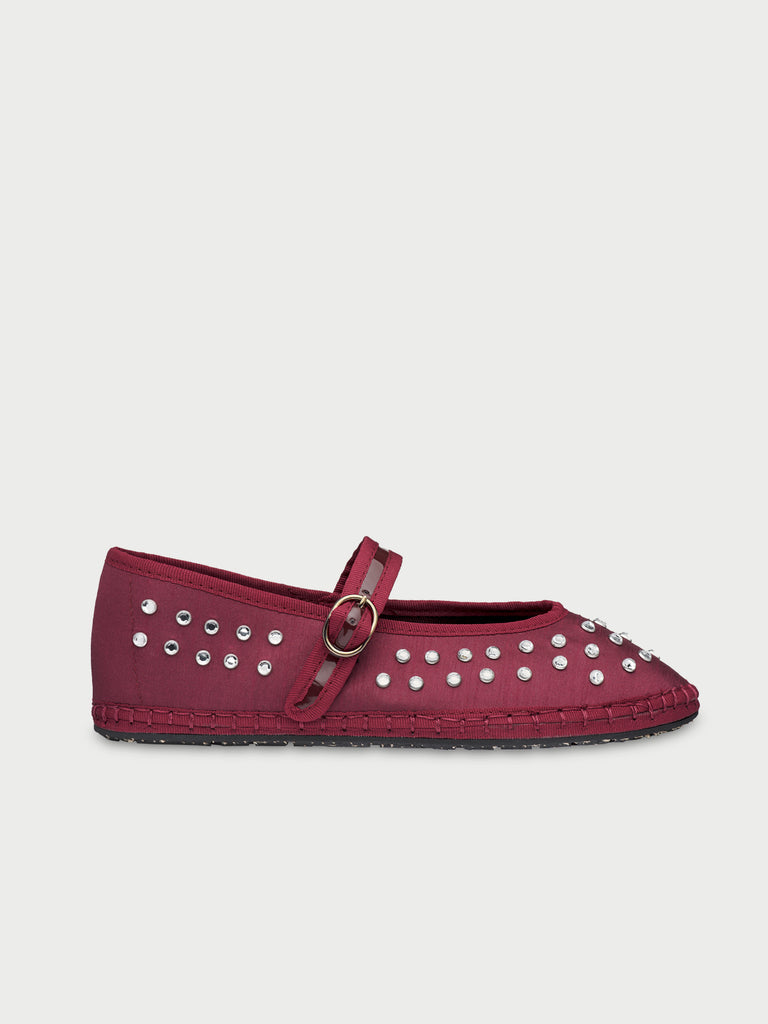 • Bailarina de seda con escote en V en color burdeos con ribetes en color burdeos y tachuelas de cristal.