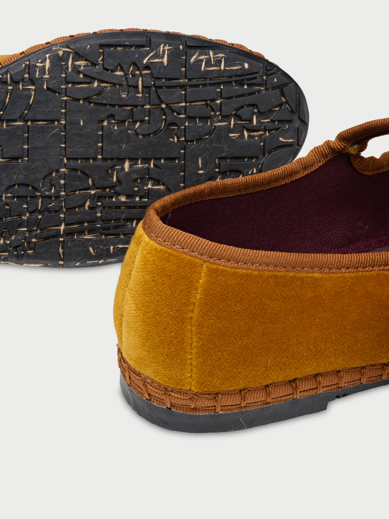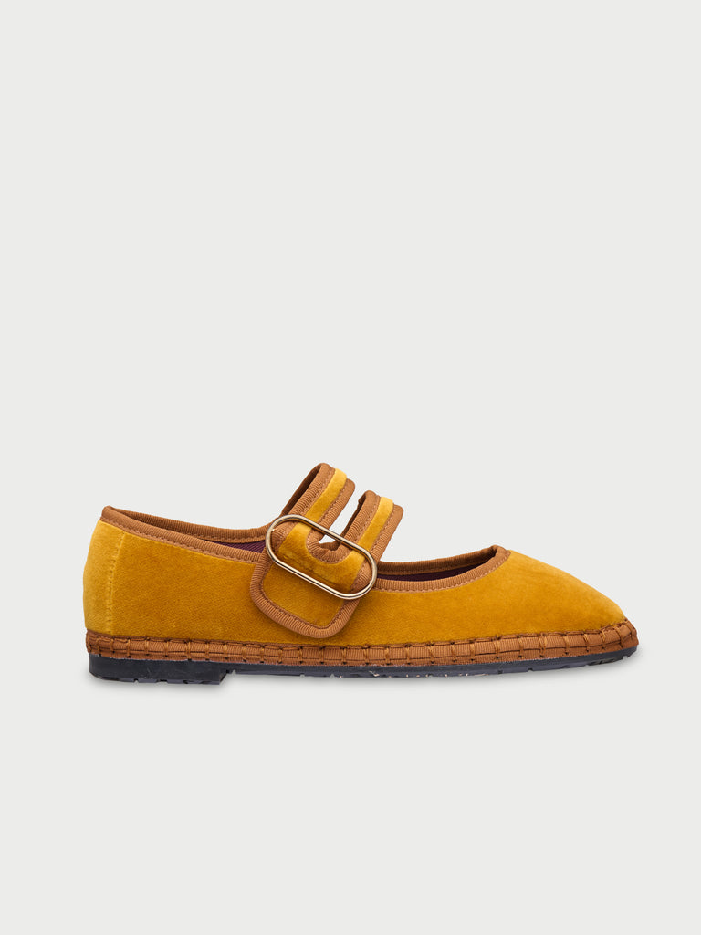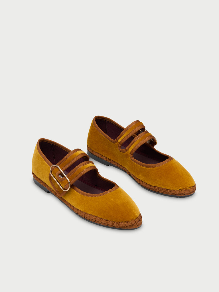 • Mercedita de terciopelo con dos tiras en mostaza con ribetes mostaza y falsa hebilla.