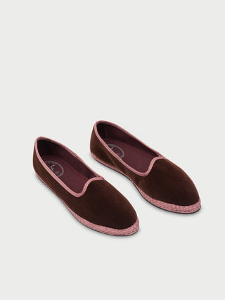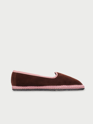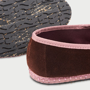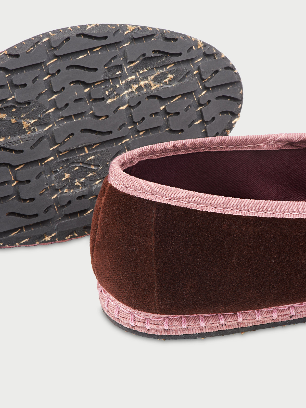 • Slipper de terciopelo en color marrón con ribetes en rosa claro.