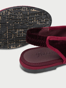• Zapatilla de terciopelo en burdeos oscuro con empeine granate, banda elástica y ribete burdeos.