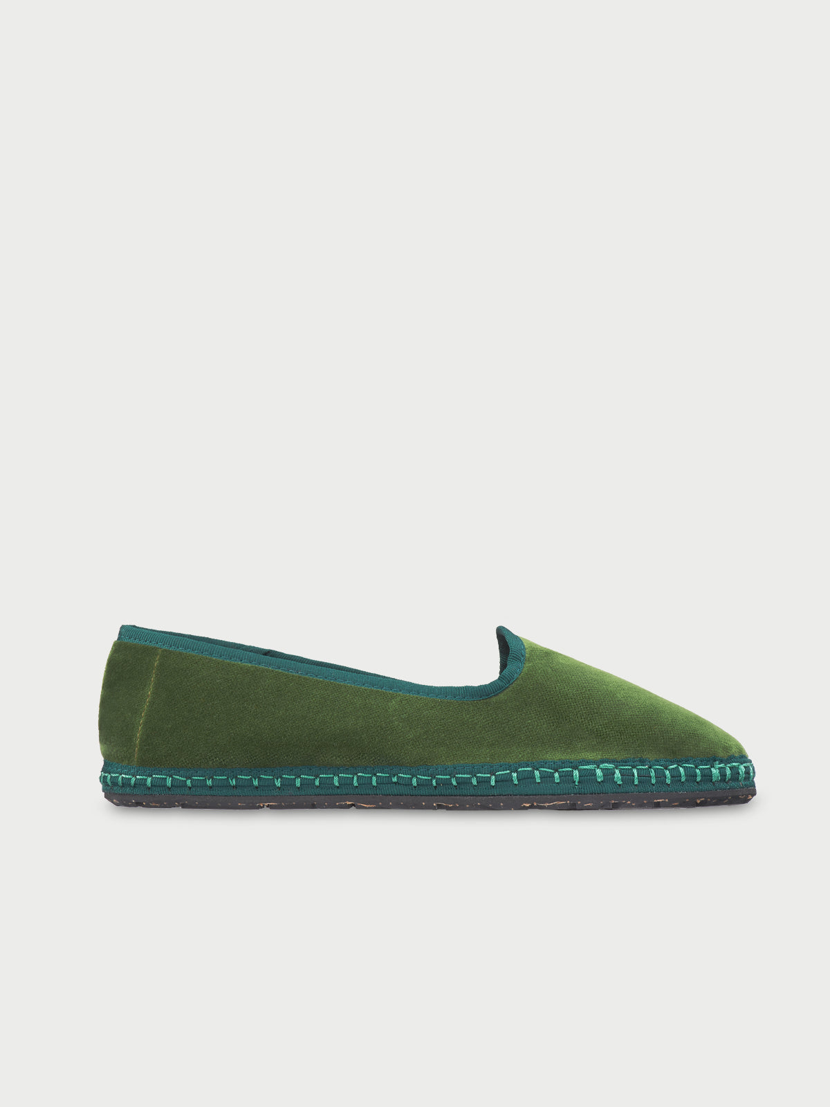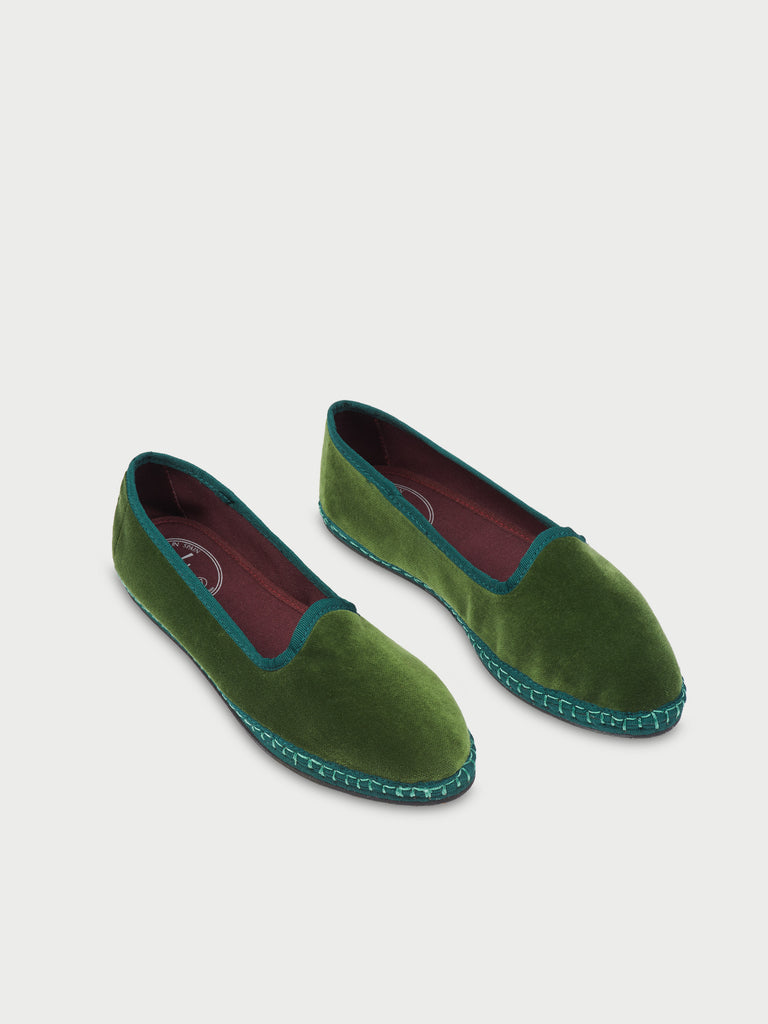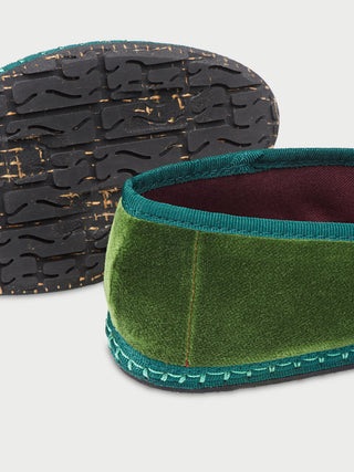 • Slipper de terciopelo en color verde oliva con ribetes en verde petróleo.