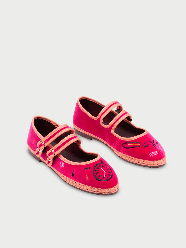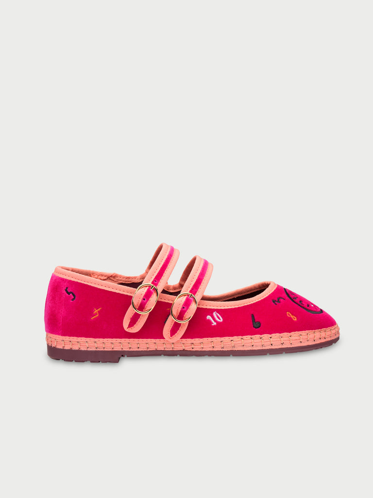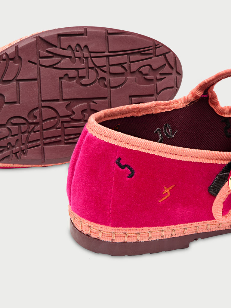 • Mary jane de terciopelo con doble tira en fucsia con ribete naranja claro y cierre de hebilla.