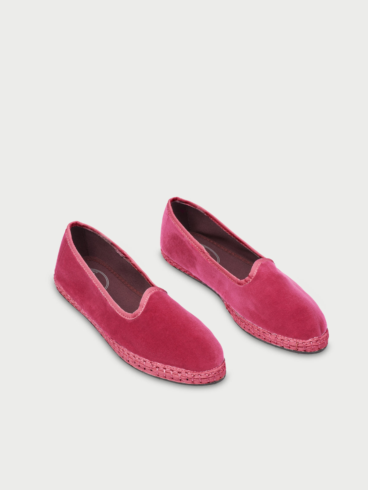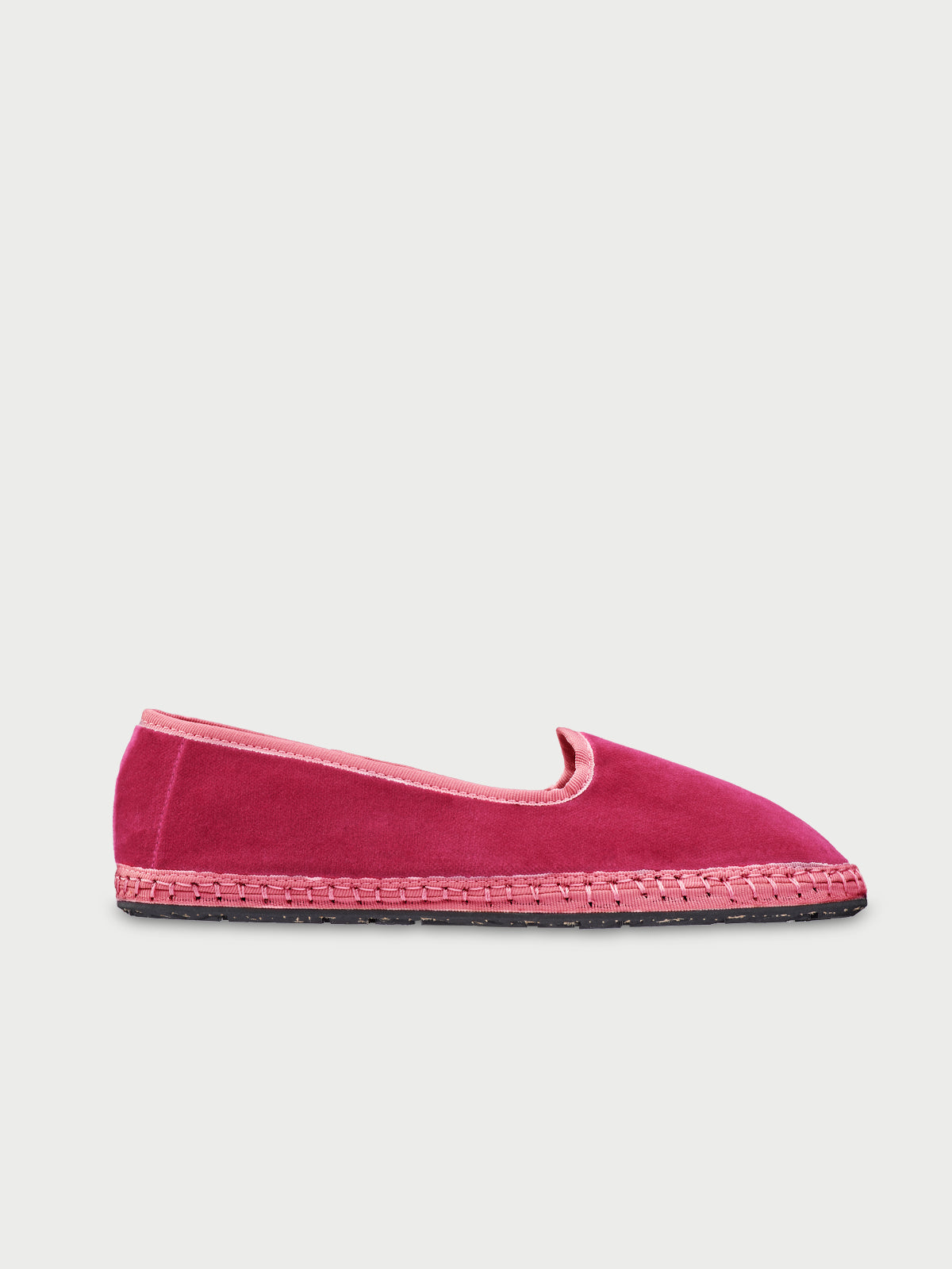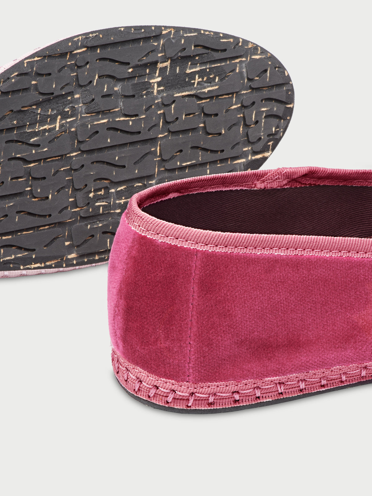 • Slippers de terciopelo en color fucsia con ribetes rosas.