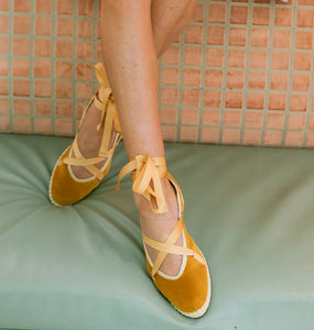 • Slipper de terciopelo en color amarillo oscuro con ribetes en amarillo claro y lazos amarillos.