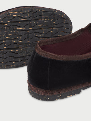 • Mercedita de terciopelo en color negro con ribetes marrones y cierre de hebilla.