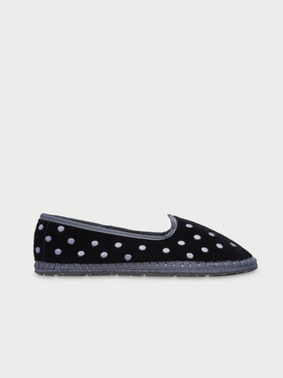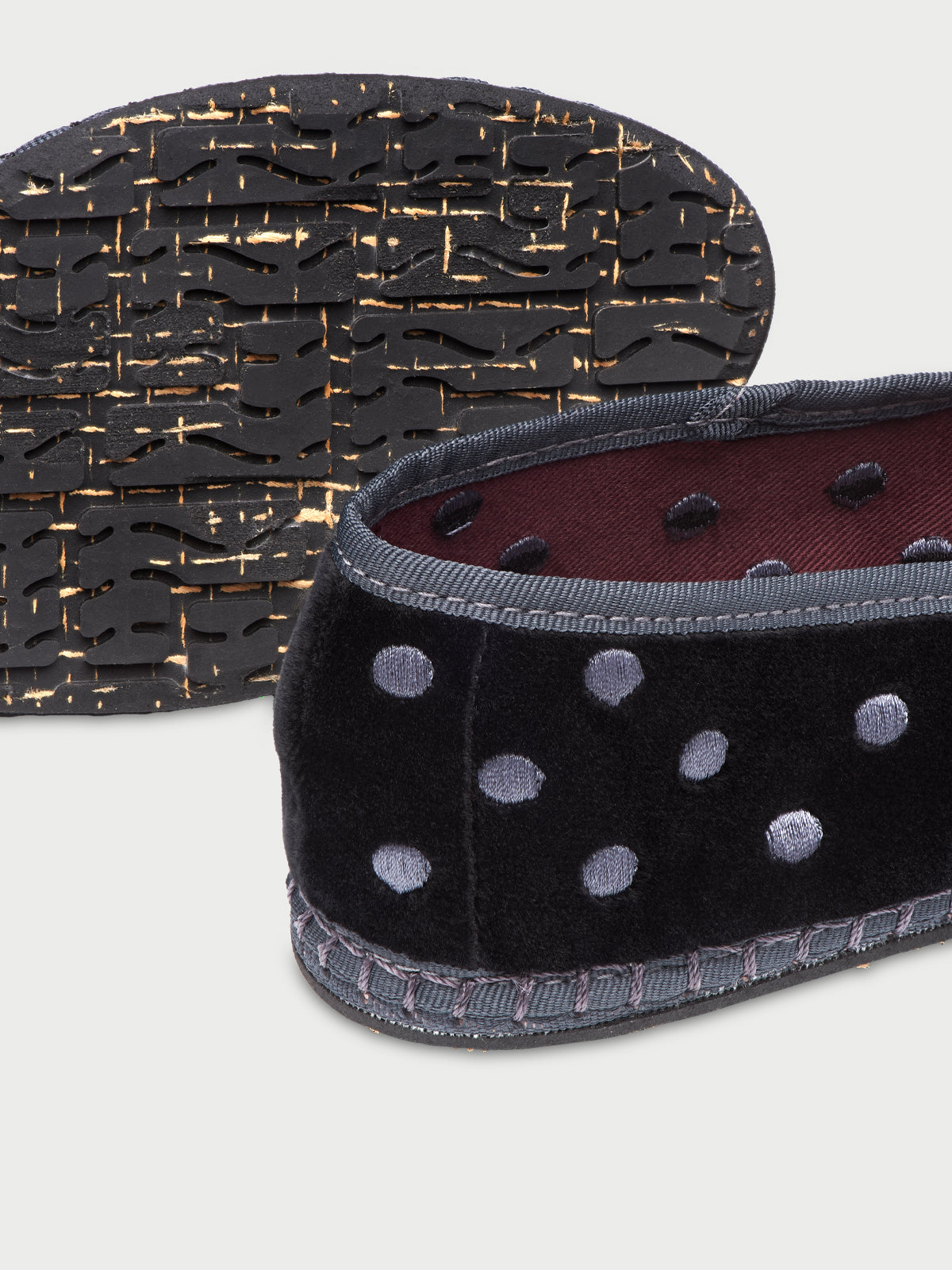 • Mercedita de terciopelo en color negro con ribetes grises y lunares grises bordados.