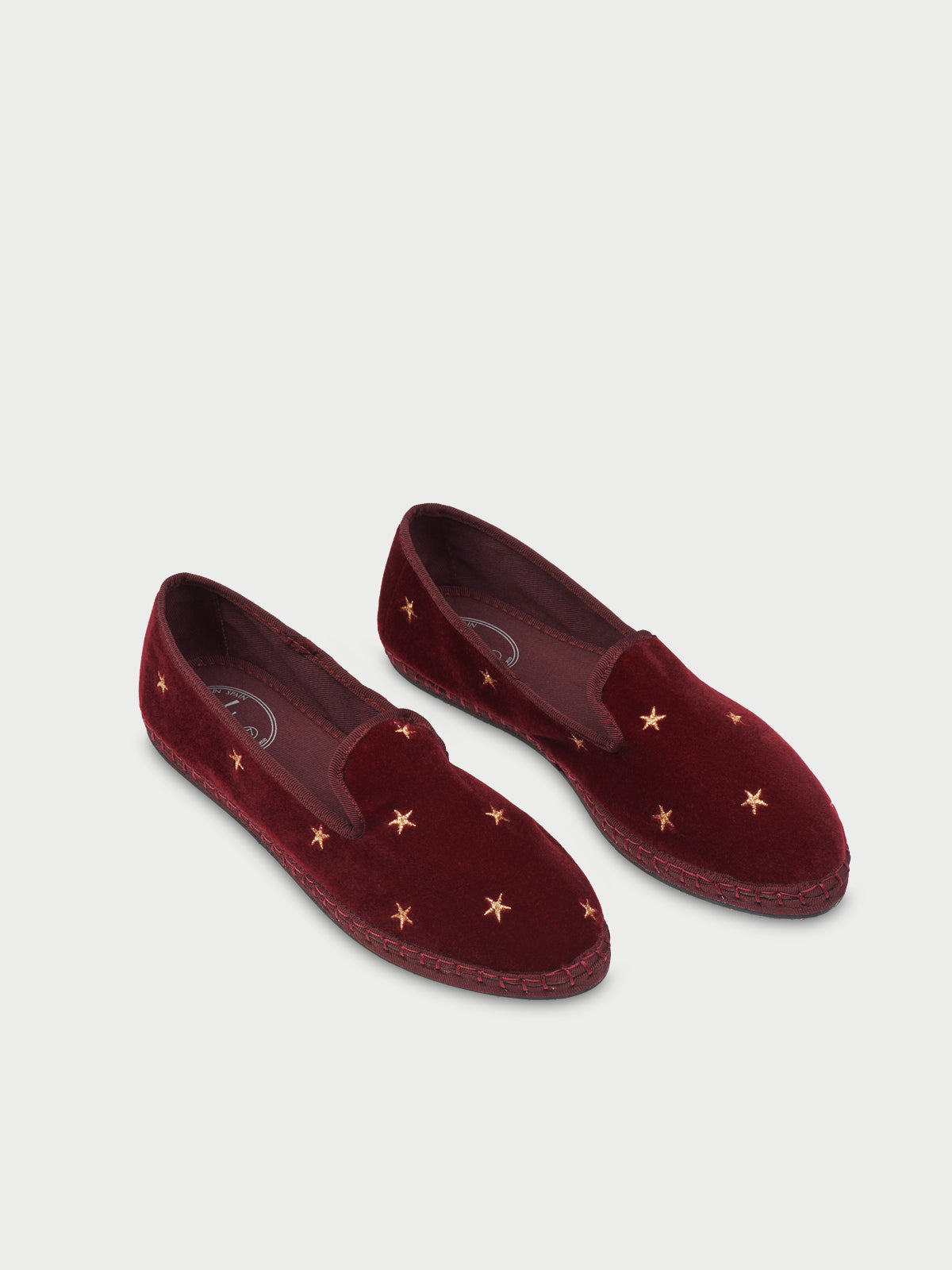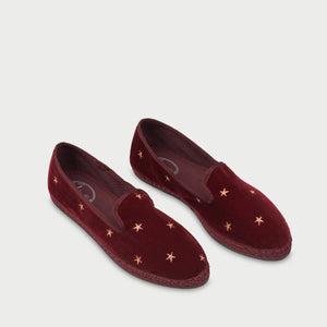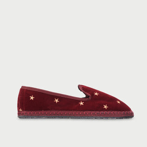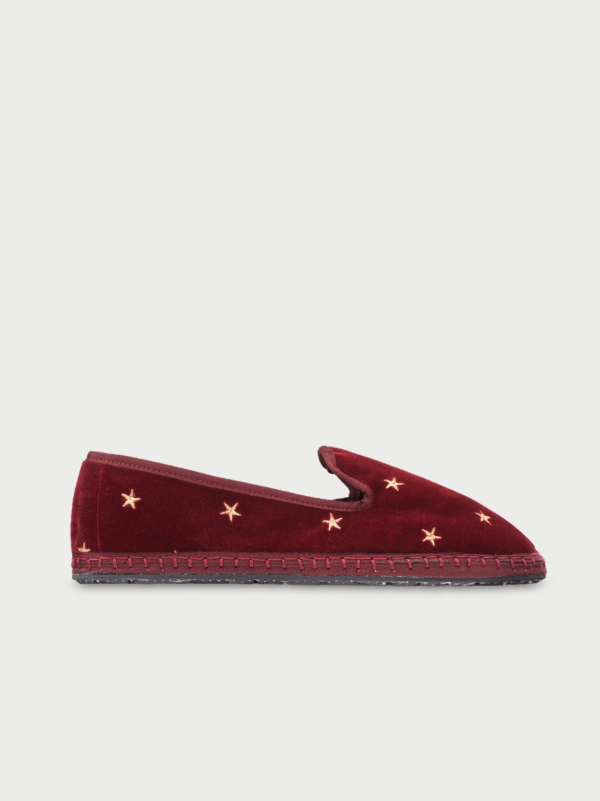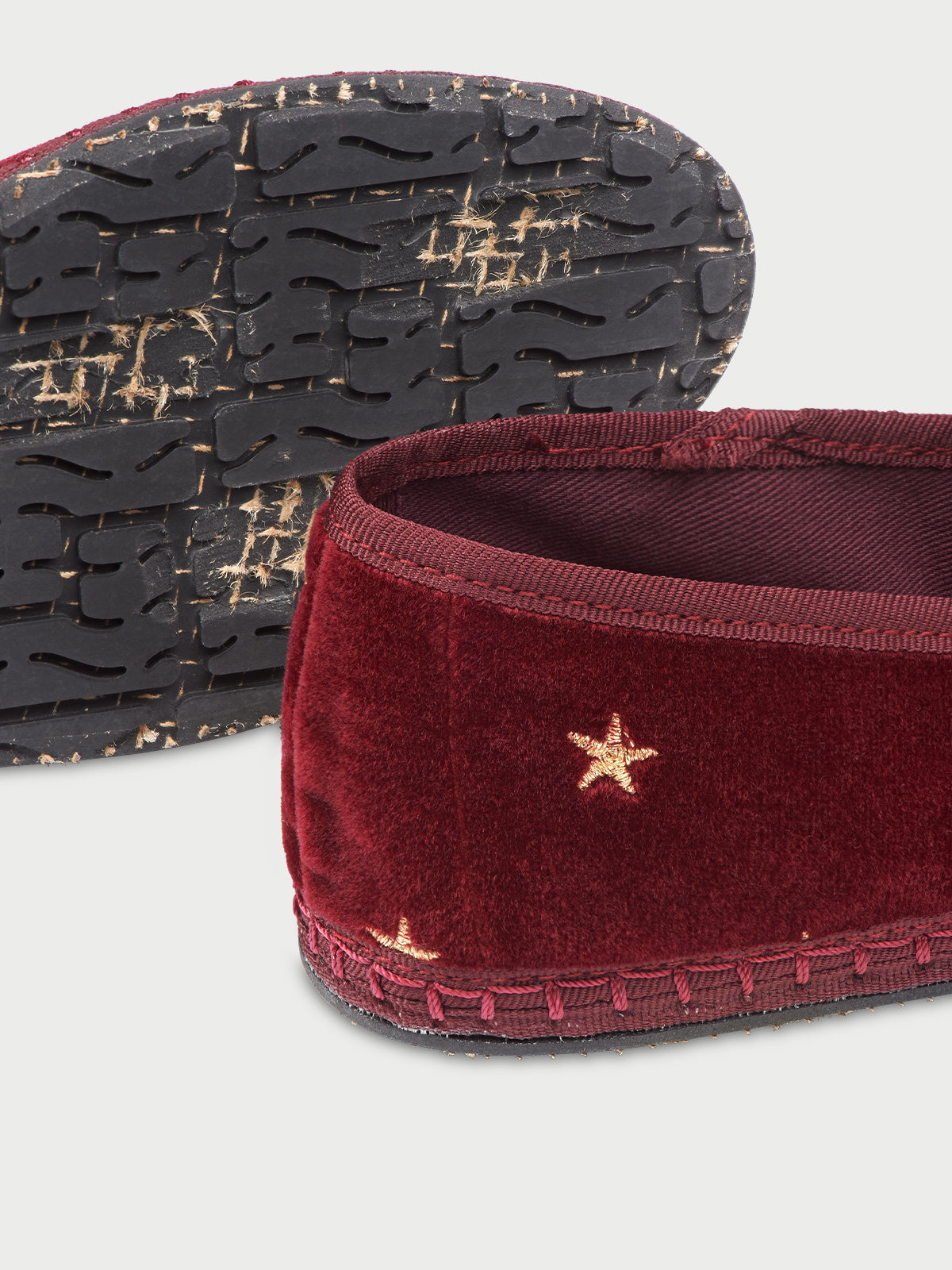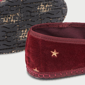 • Slipper de terciopelo burdeos con ribetes burdeos y estrellas cosidas en dorado.