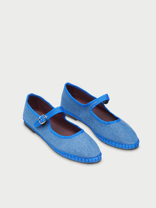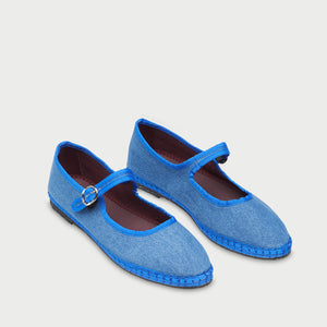 • Mercedita vaquera en color azul oscuro con ribetes azules y cierre de hebilla.