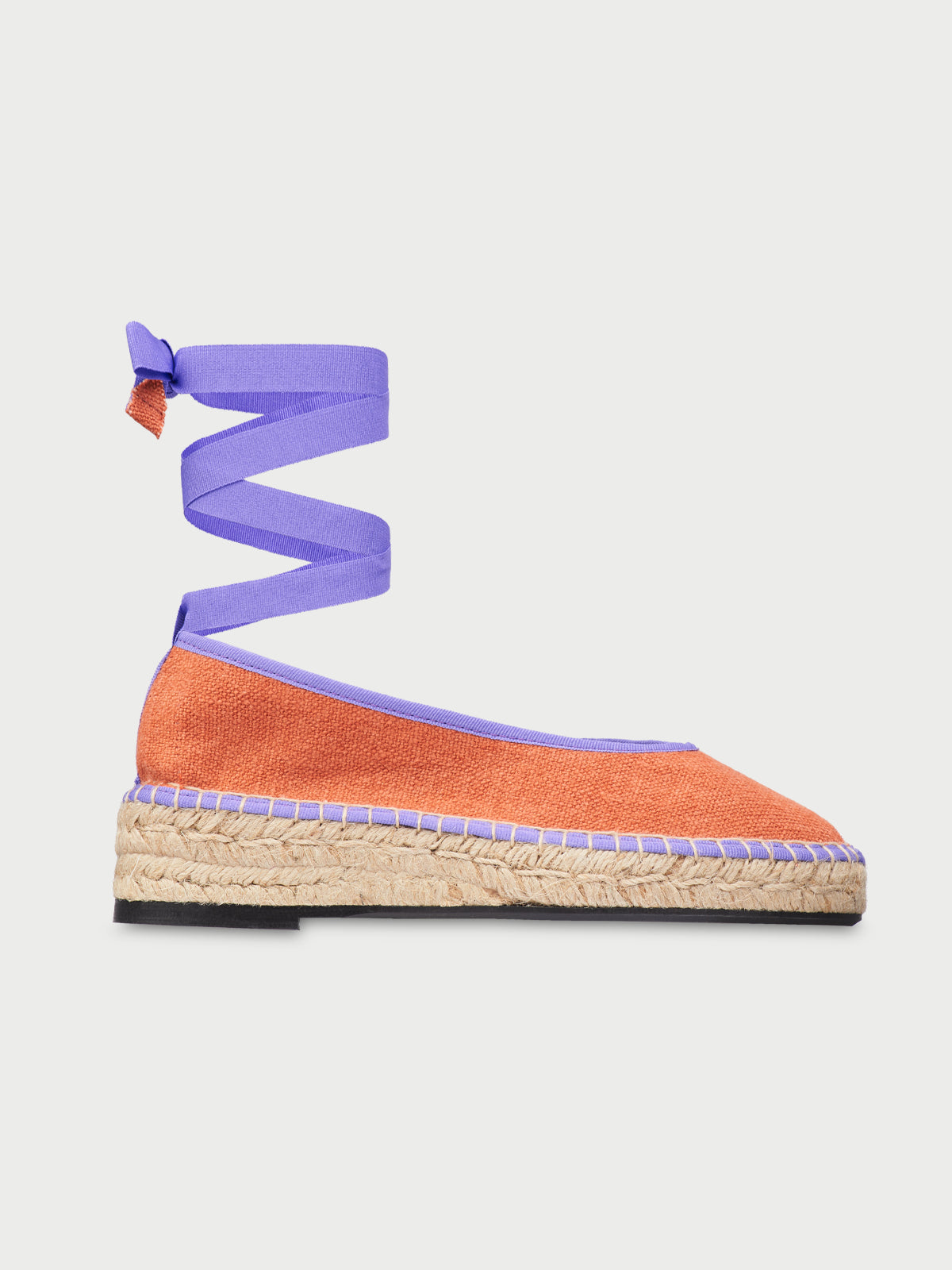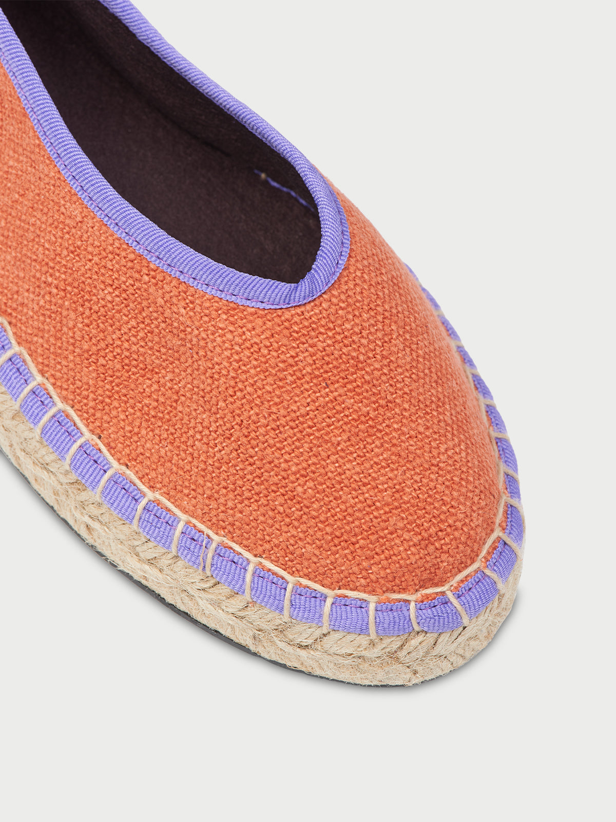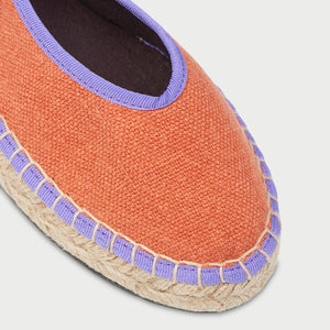 • Bailarina de lino en color naranja con ribetes morados y lazos morados. Suela de yute natural.