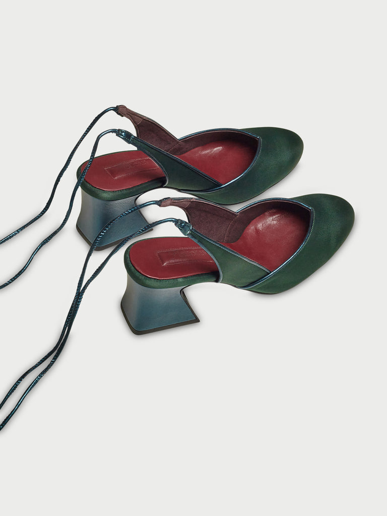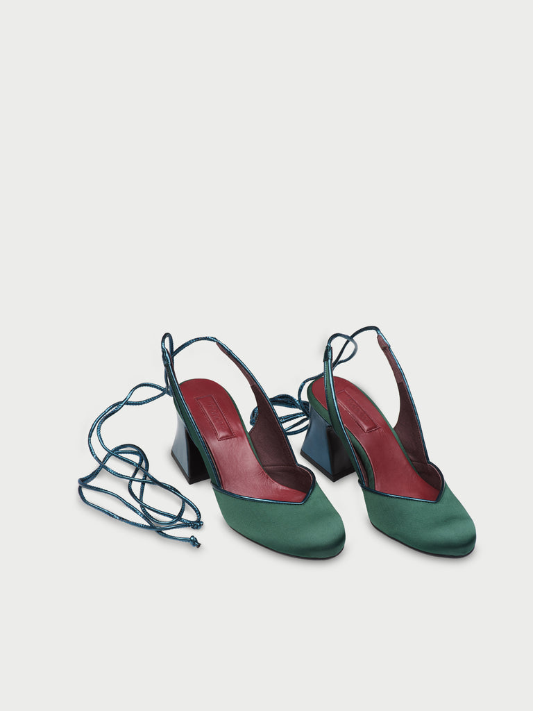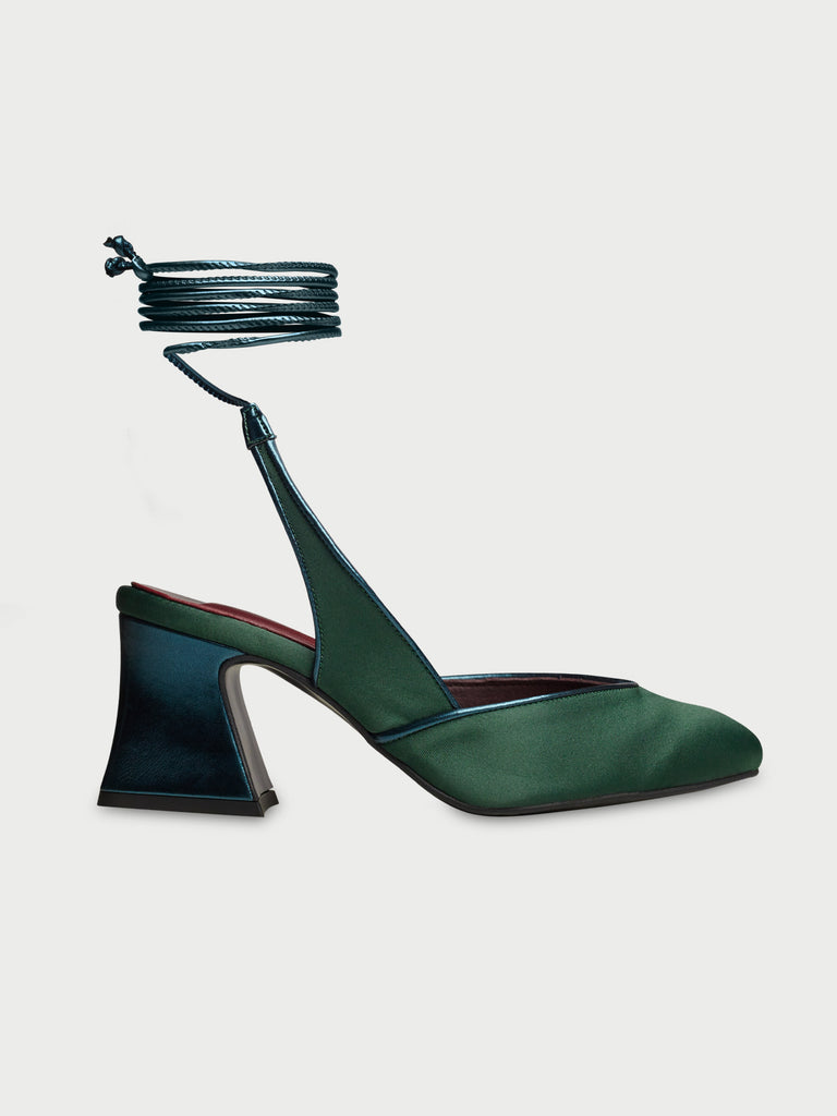 • Tacones de raso color verde petróleo con escote en pico rematado con finos lazos atados al tobillo.