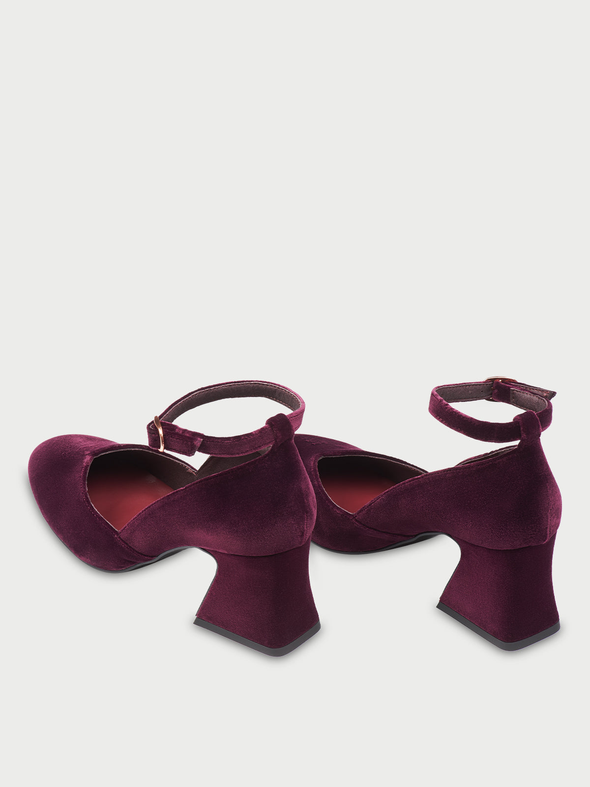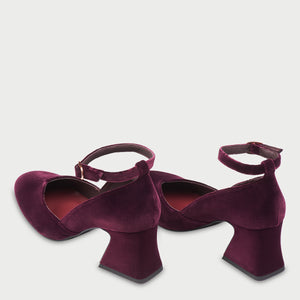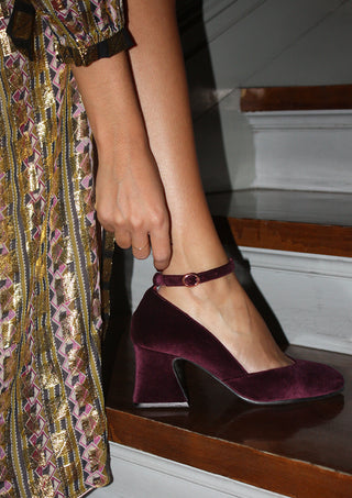 • Zapatos de salón de terciopelo granate con forro de piel.