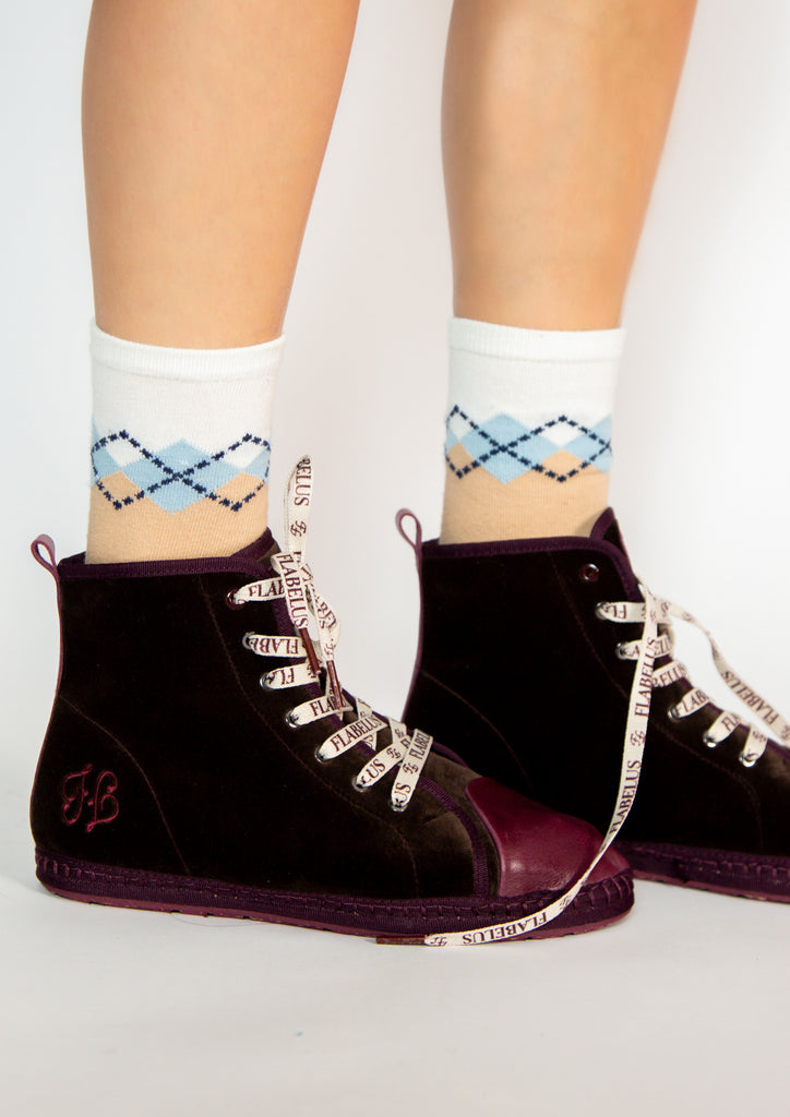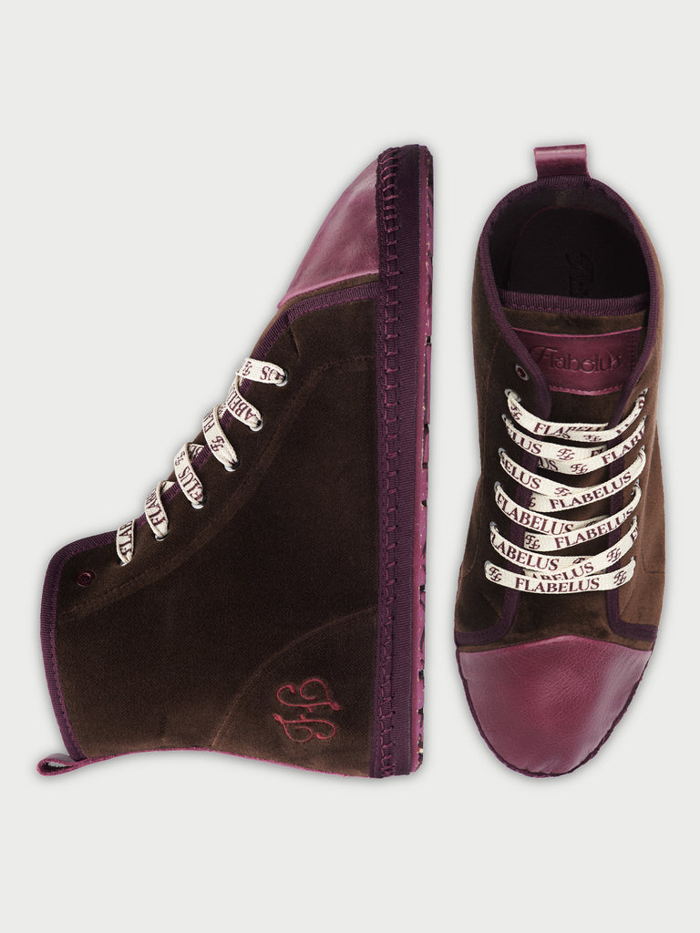 • Botín con plataforma plana y lazos de terciopelo de algodón marrón con ribetes burdeos y puntera y detalles de cuero burdeos.