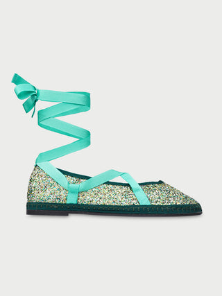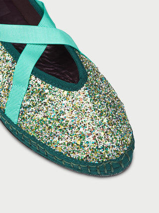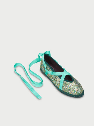 • Slippers de algodón con purpurina en verde con ribetes en verde oscuro claro y lazos en verde claro.