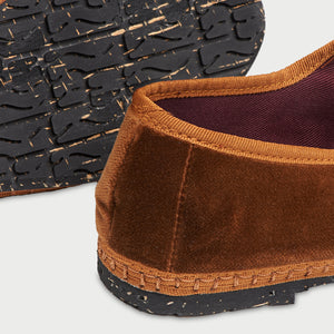 • Mercedita de terciopelo en color marrón con ribetes marrones y cierre de hebilla.