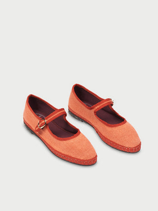 • Aged linen mary jane in orange with dark orange piping and buckle closure.