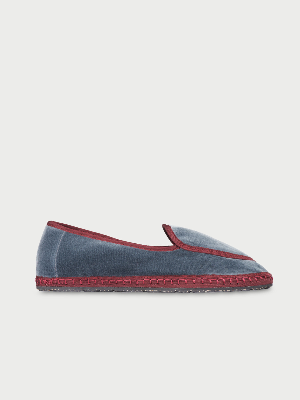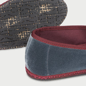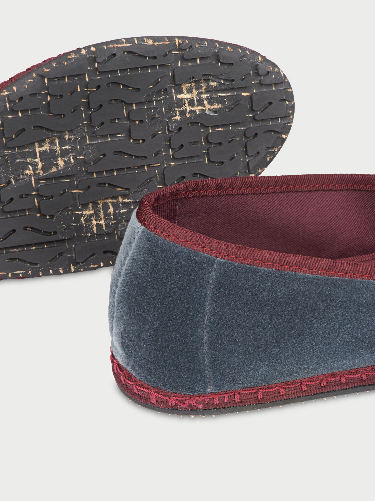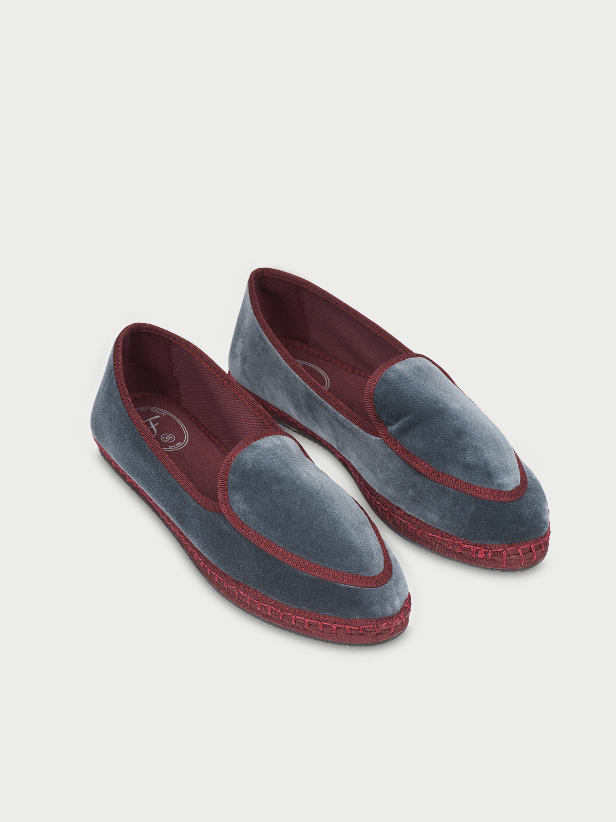 • Velvet belgian in grey with grey instep and burgundy piping.