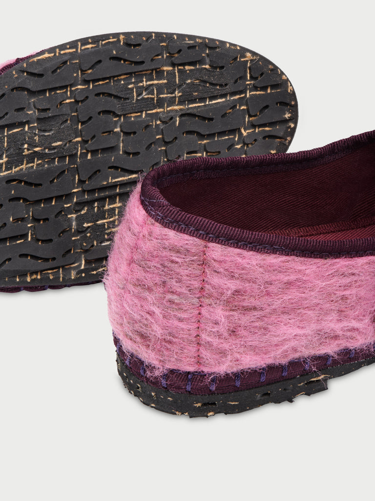 • Wool mary jane in pink with dark purple piping and buckle closure.
