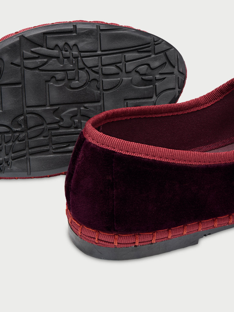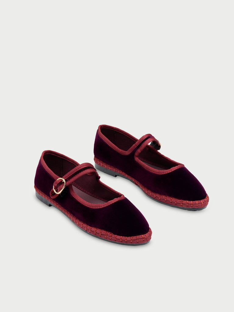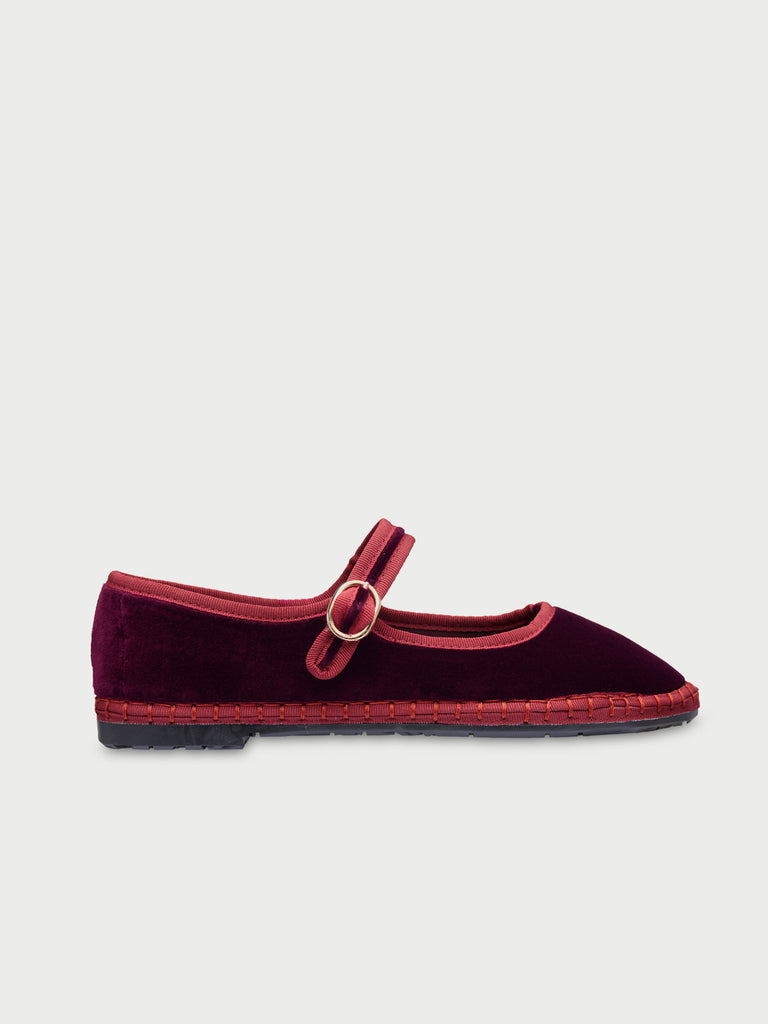 • Velvet mary jane in dark red with red piping and buckle closure.