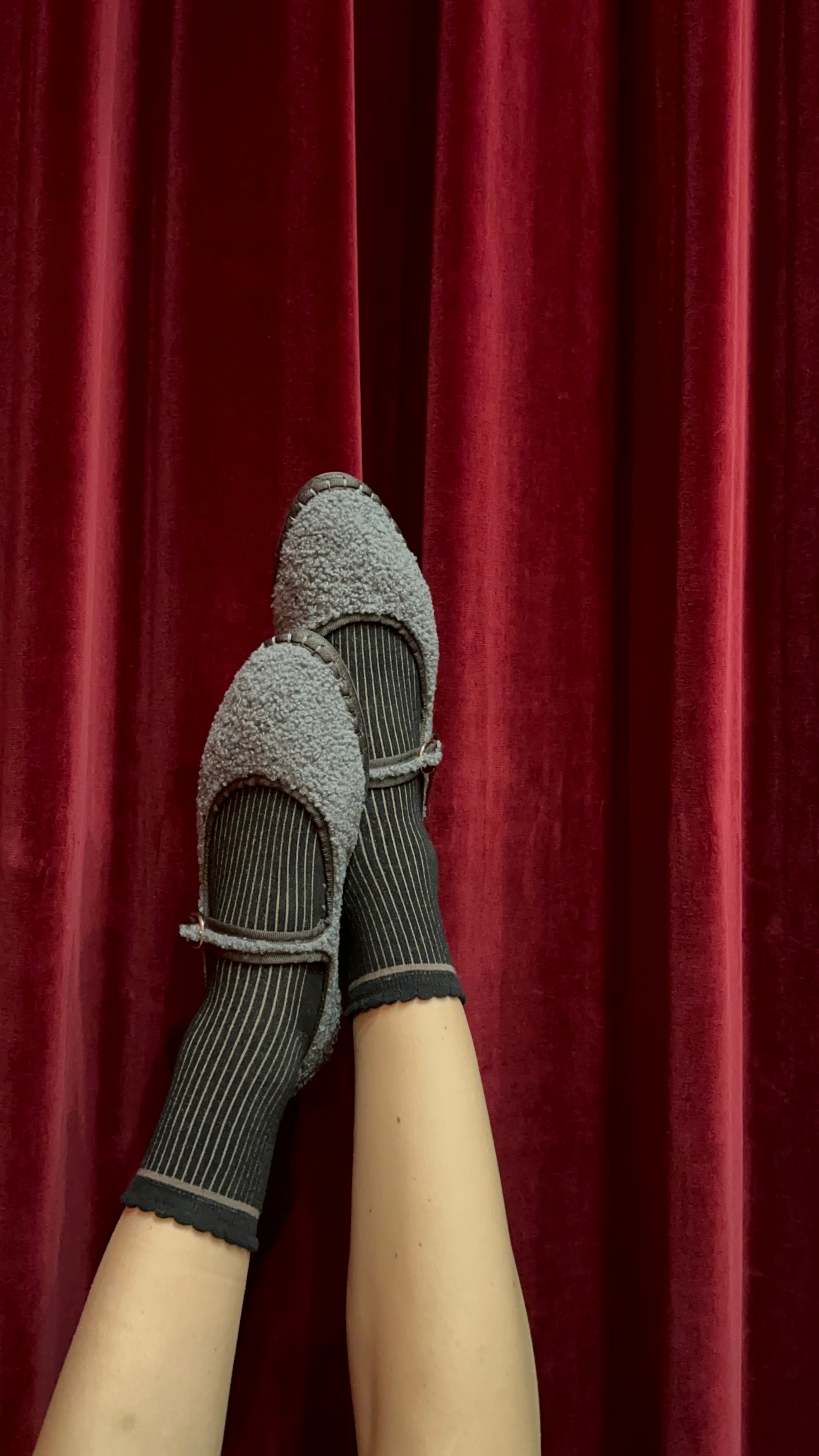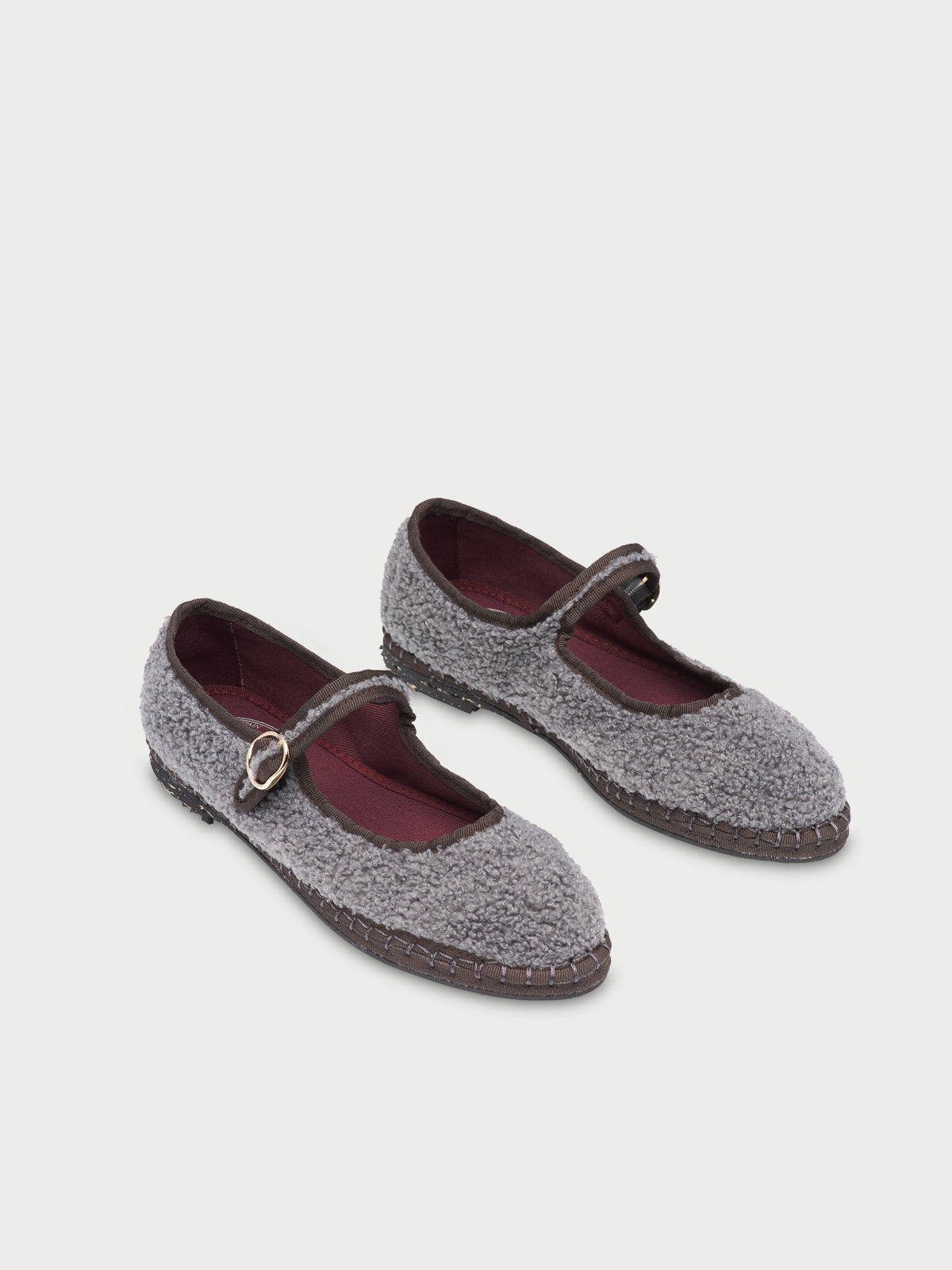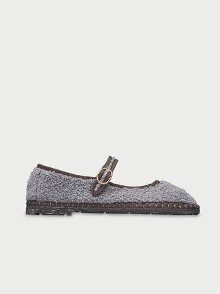 • Wool mary jane in grey with dark grey piping and buckle closure.